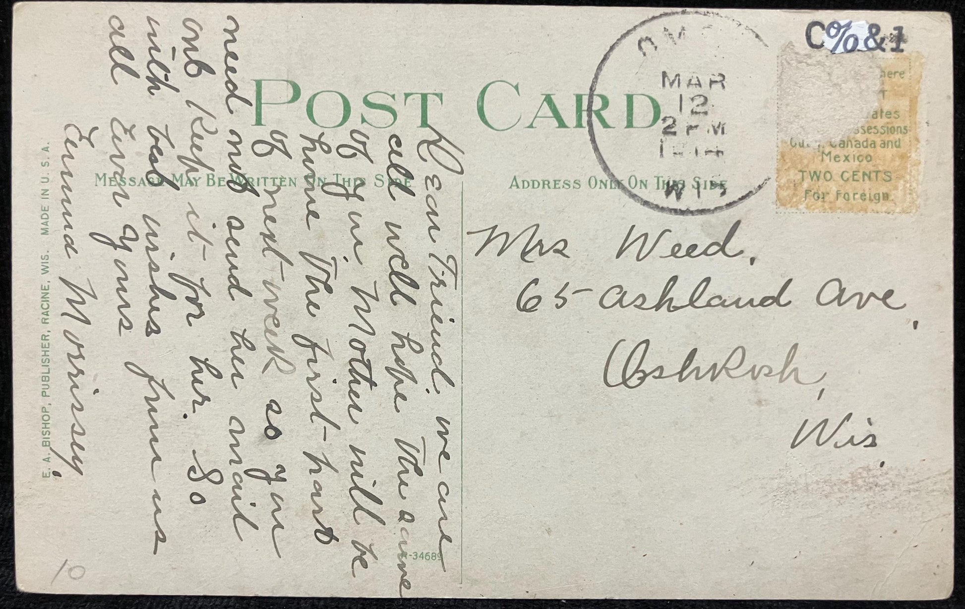 Mailed: Postmark: 1912 - stamp removed