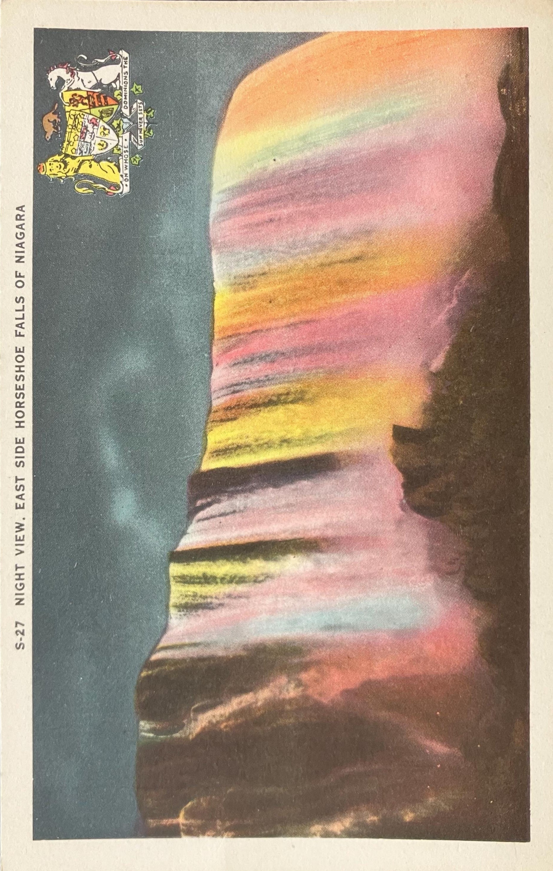 Front: Night View. East Side of Horseshoe Falls of Niagara with the Canadian Coat of Arms