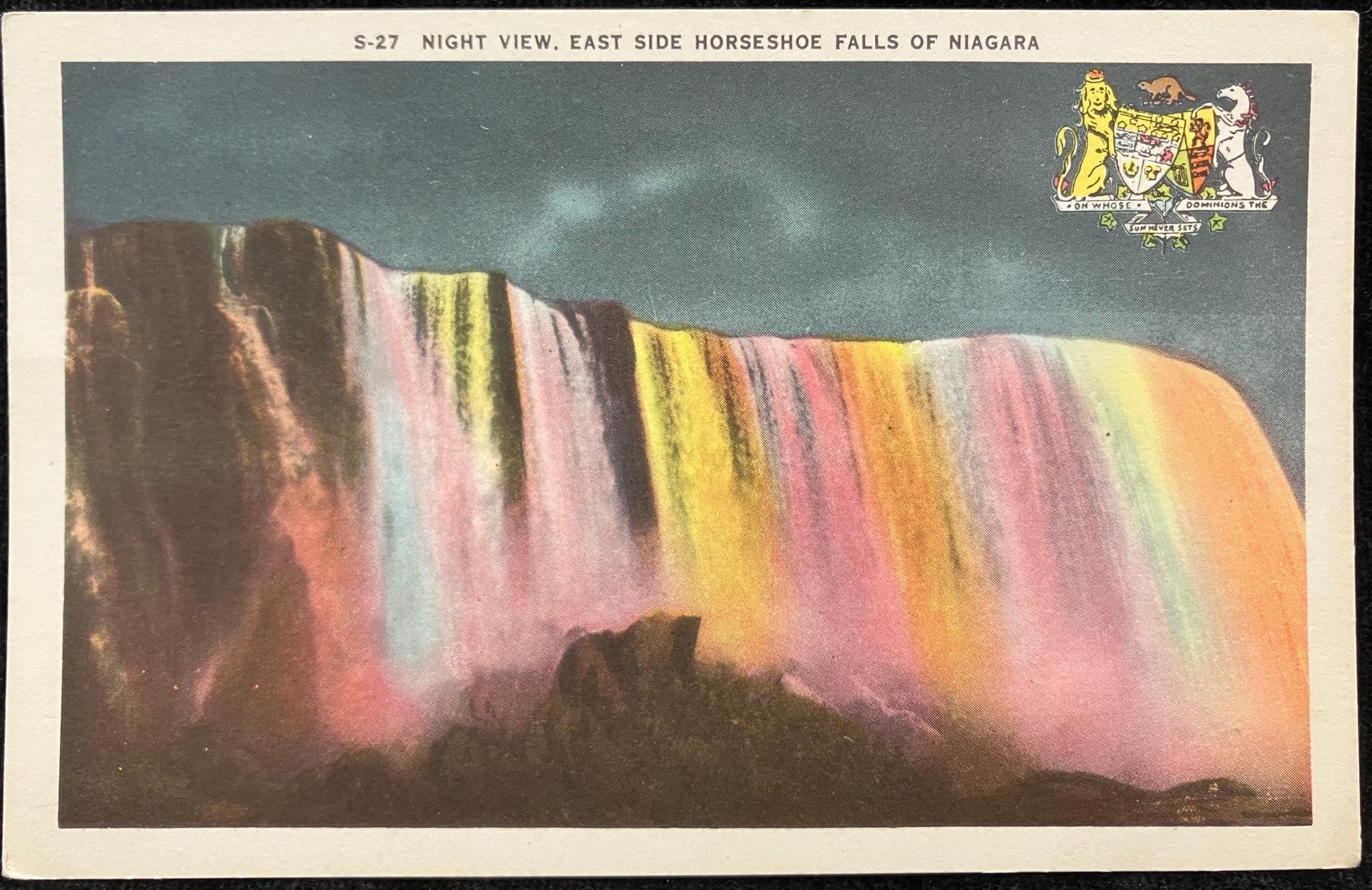 Night View - East Side of Horseshoe Falls of Niagara - Canadian Coat of Arms - Printed in Canada - Vintage Waterfall Postcard