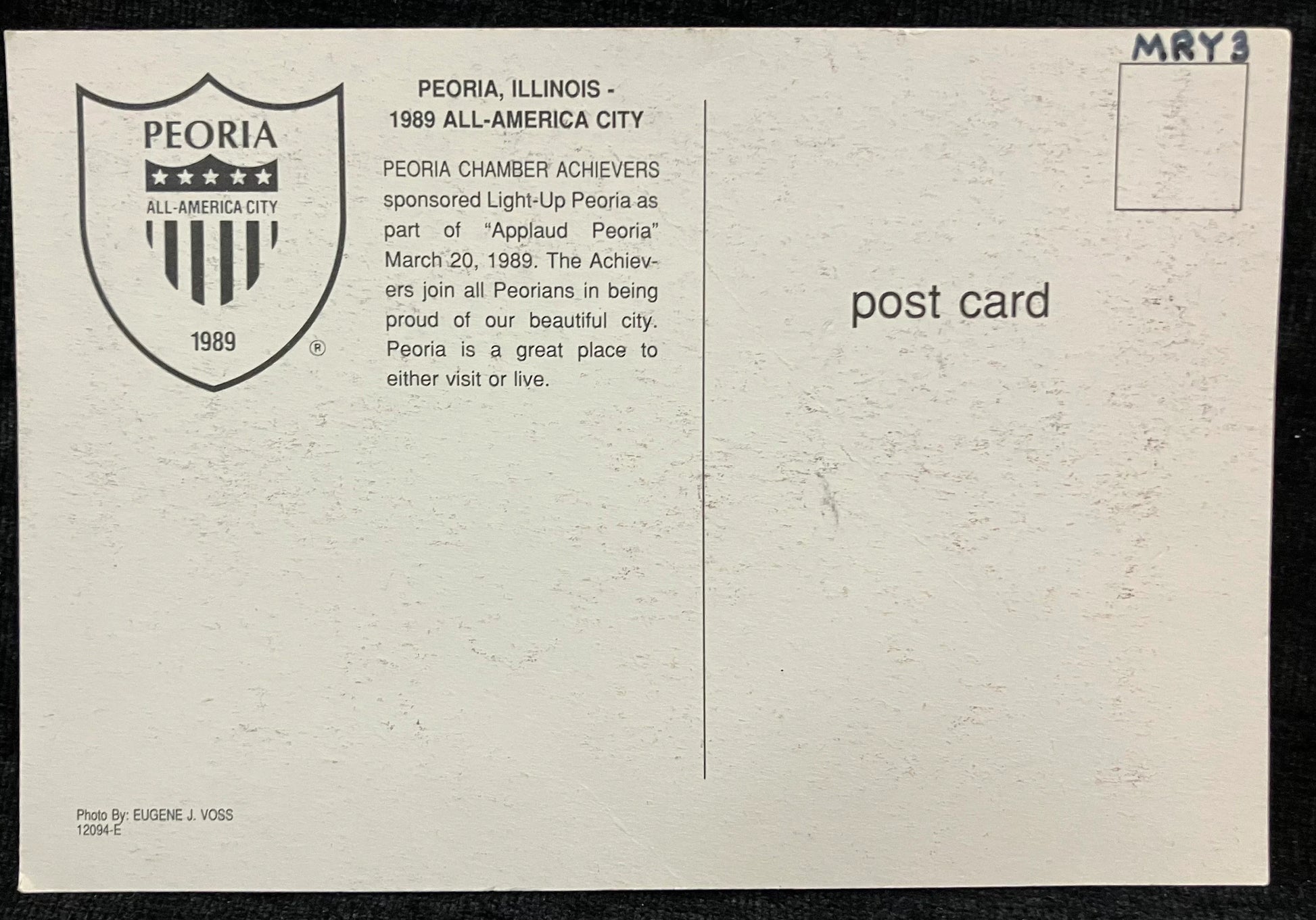 Back: Peoria Illinois - 1989 All-America City Peoria Chamber Achievers sponsored Light-Up Peoria as part of “Applaud Peoria” March 20, 1989. The Achievers join all Peorians in being proud of our beautiful city. Peoria is a great place to either visit or live.