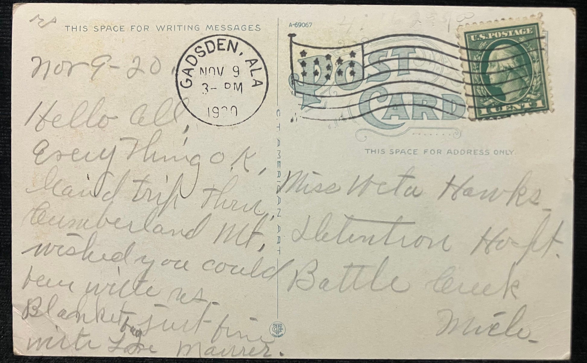 Mailed: Postmark on November 9, 1920 from Gadsden, Alabama with a green one cent George Washington stamp