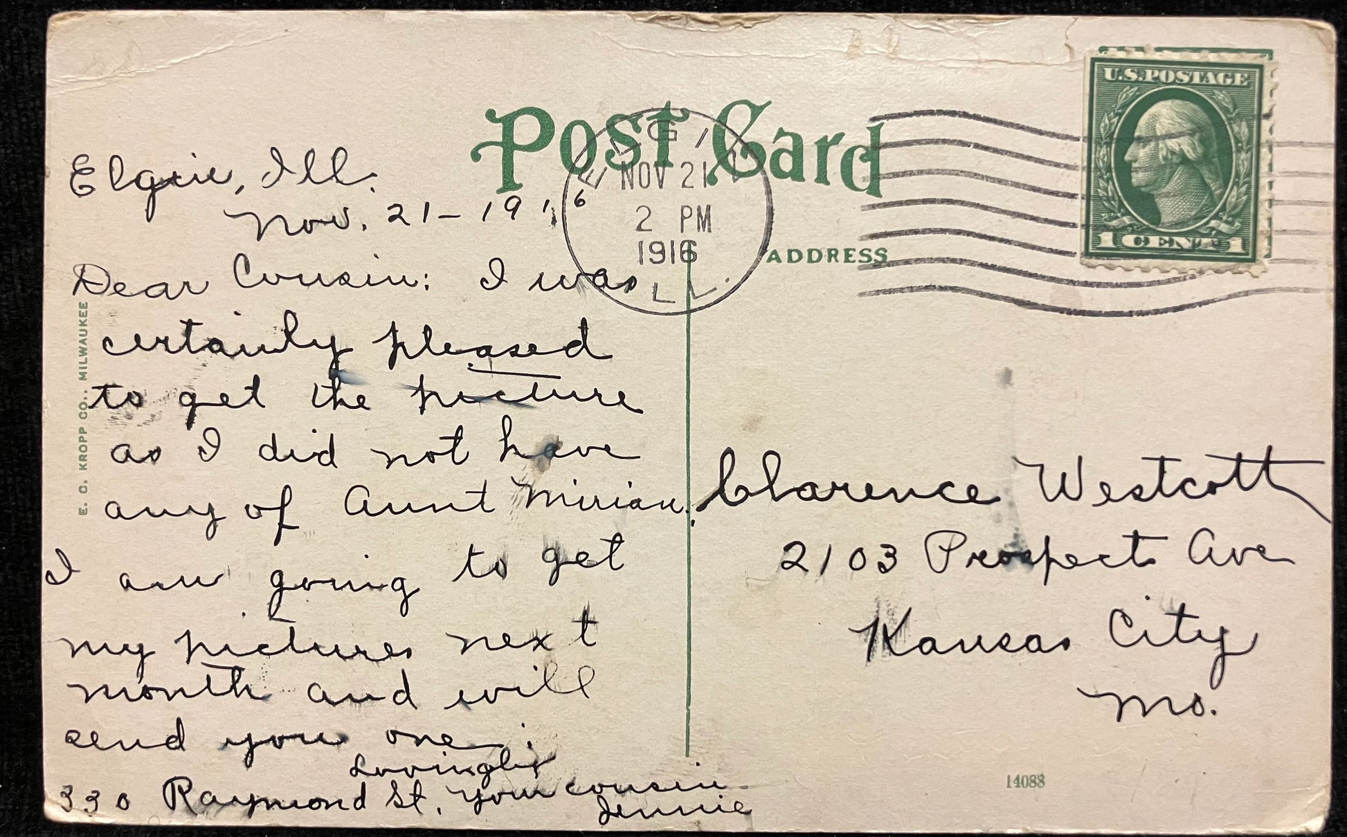 Mailed: Postmark 1916, Elgin, Ill. green one cent George Washington stamp
