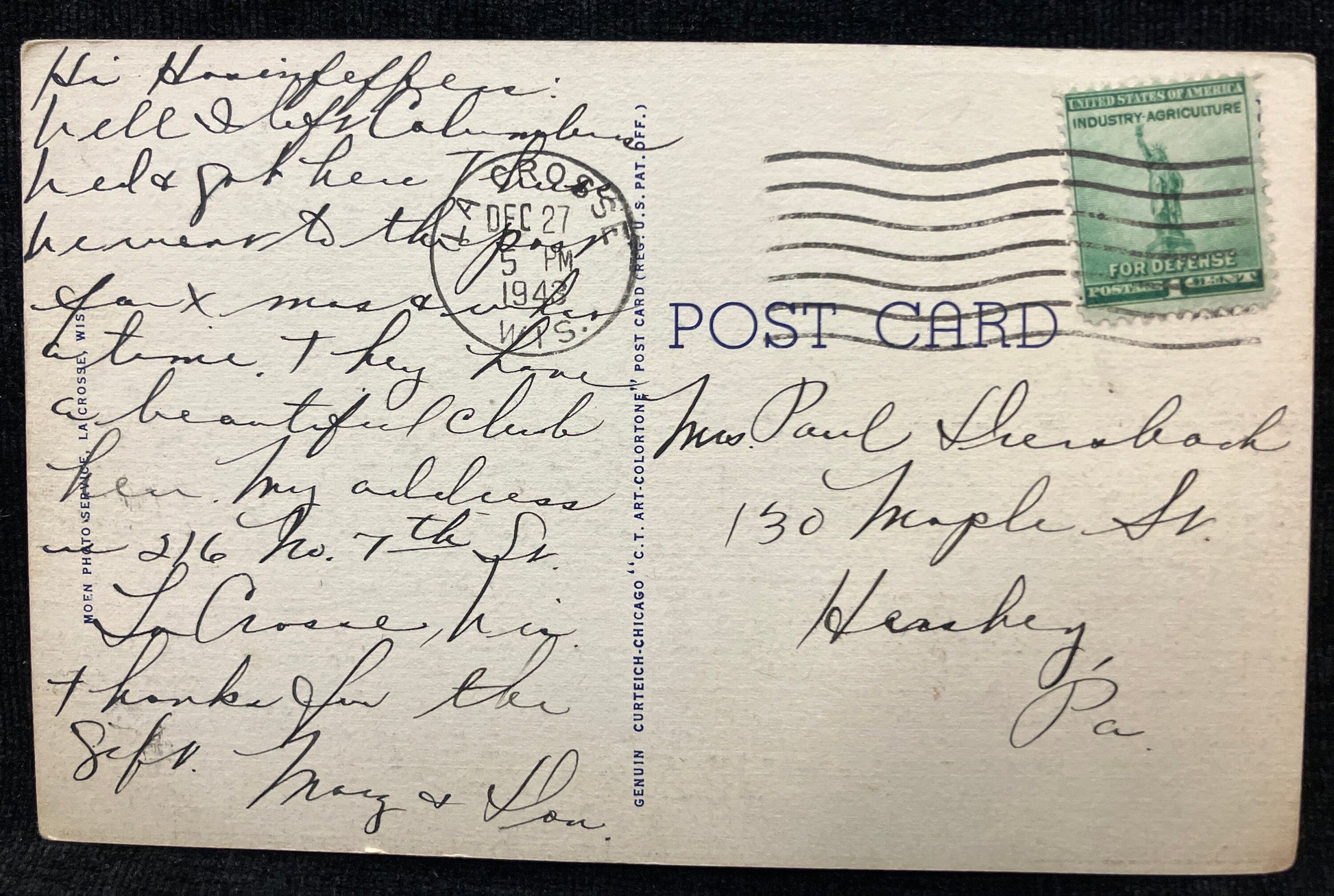 Mailed: Postmark in 1943, La Cross Wis. , one cent green Industry-Agricutlure for Defense Stamp