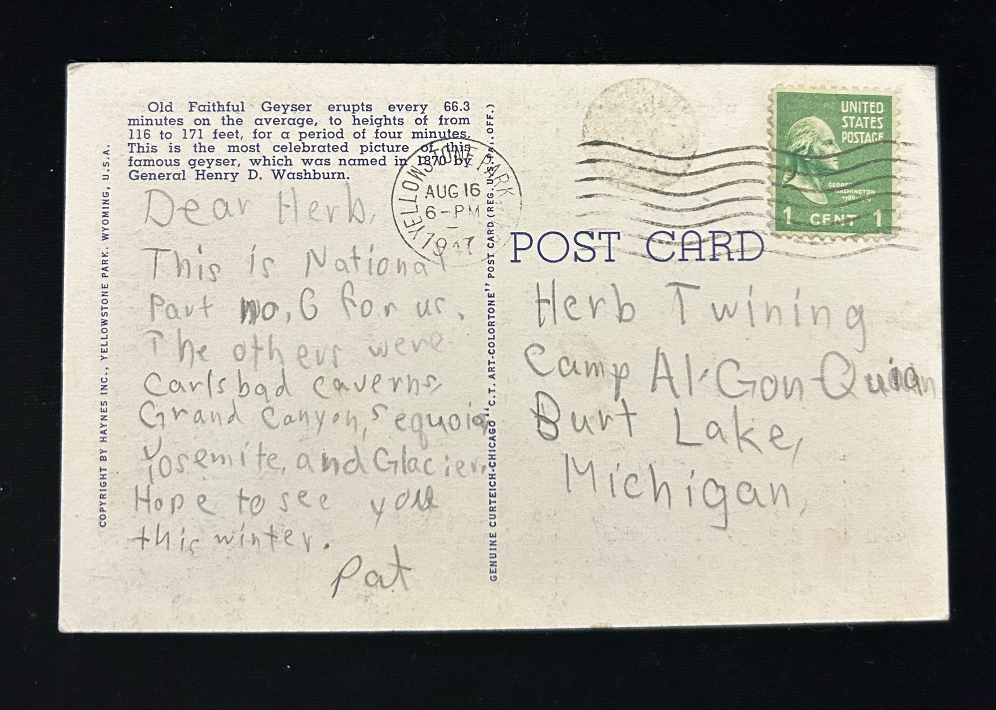 Back: "Old Faithful Geyser erupts every 66.3 minutes on the average, to heights of from 116 to 171 feet, for a period of four minutes. This is the most celebrated picture of this famous geyser, which was named in 1870 by General Henry D. Washburn."