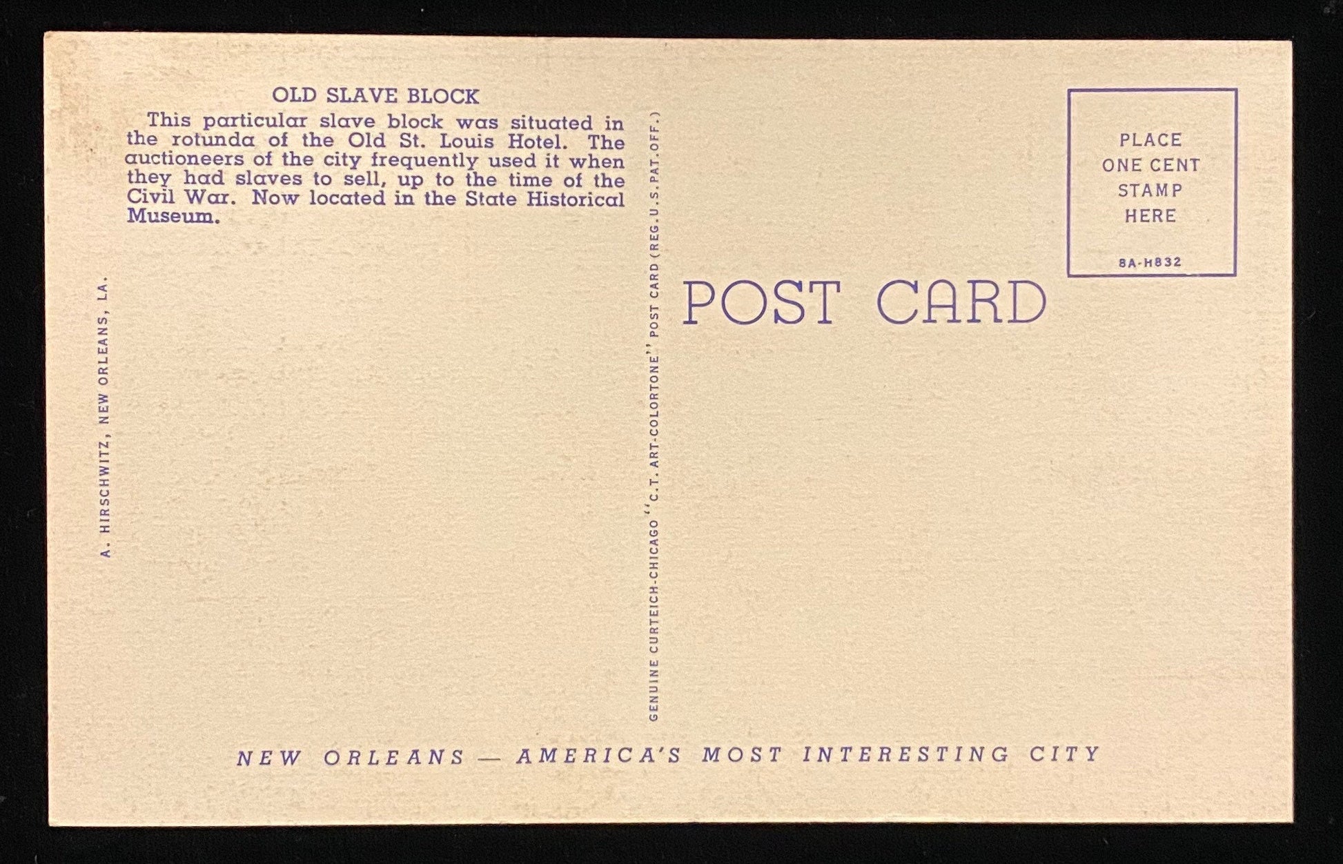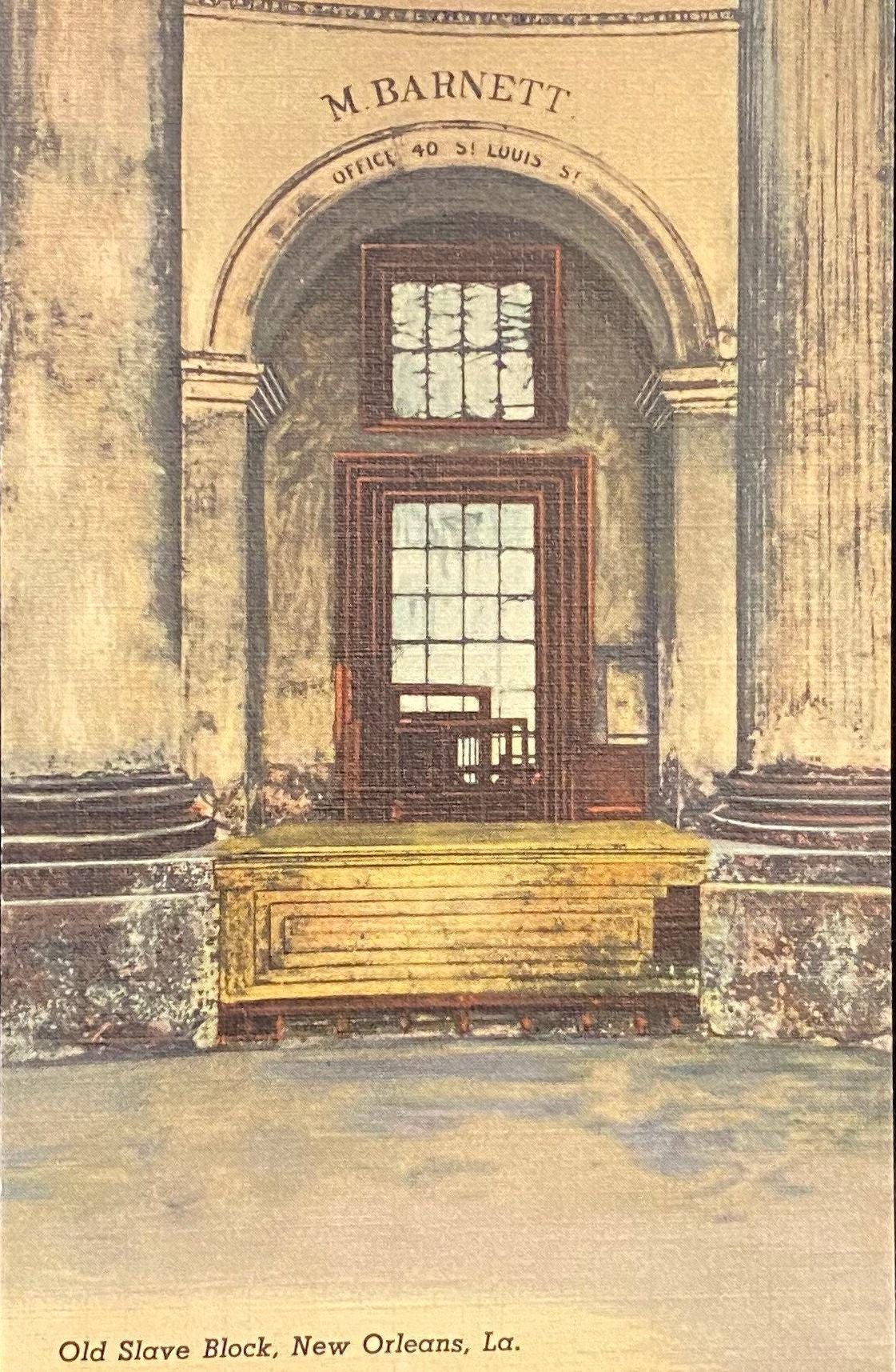 Back: "Old Slave Block. This particular slave block was situated in the rotunda of the Old St. Louis Hotel. The auctioneers of the city frequently used it when they had slaves to sell, up to the time of the Civil War. Now located in the State Historical Museum."