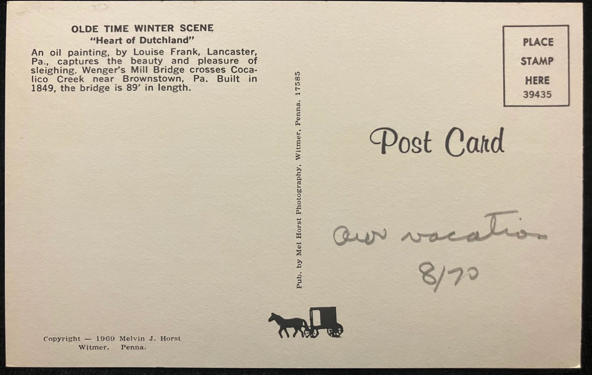 On back: OLDE TIME WINTER SCENE “Herat of Dutchland.” An oil painting, by Louise Frank, Lancaster, Pa., captures the beauty and pleasures of sleighing. Wenner’s Mill Bridge crosses Cocalico Creek near Brownstown, Pa. Built in 1849, the bridge is 89’ in length. Copyright 1969 by Melvin J. Horst
