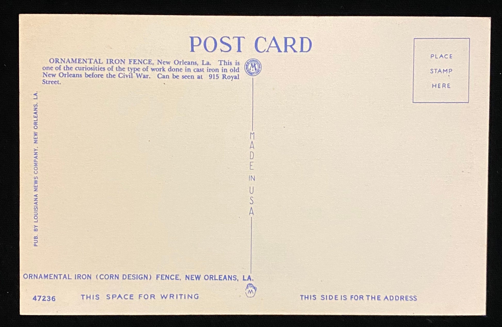 Back: "Ornamental Iron Fence, New Orleans, La. This is one of the curiosities of the type of work done in cast iron in old New Orleans before the Civil War. Can be seen at 915 Royal Street."