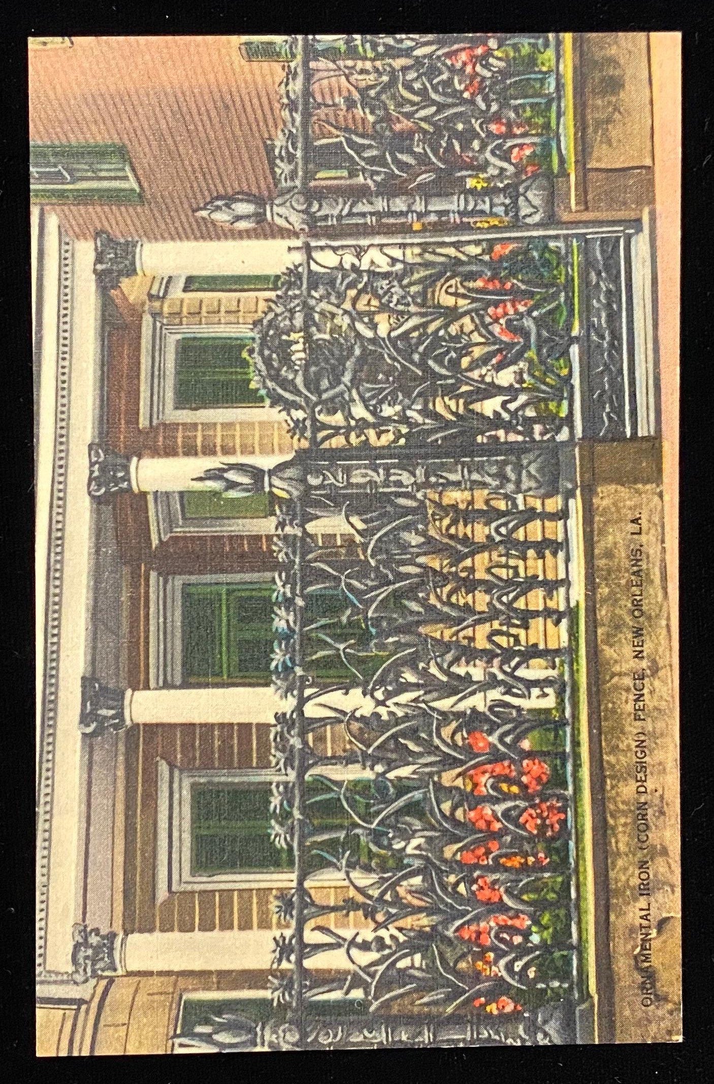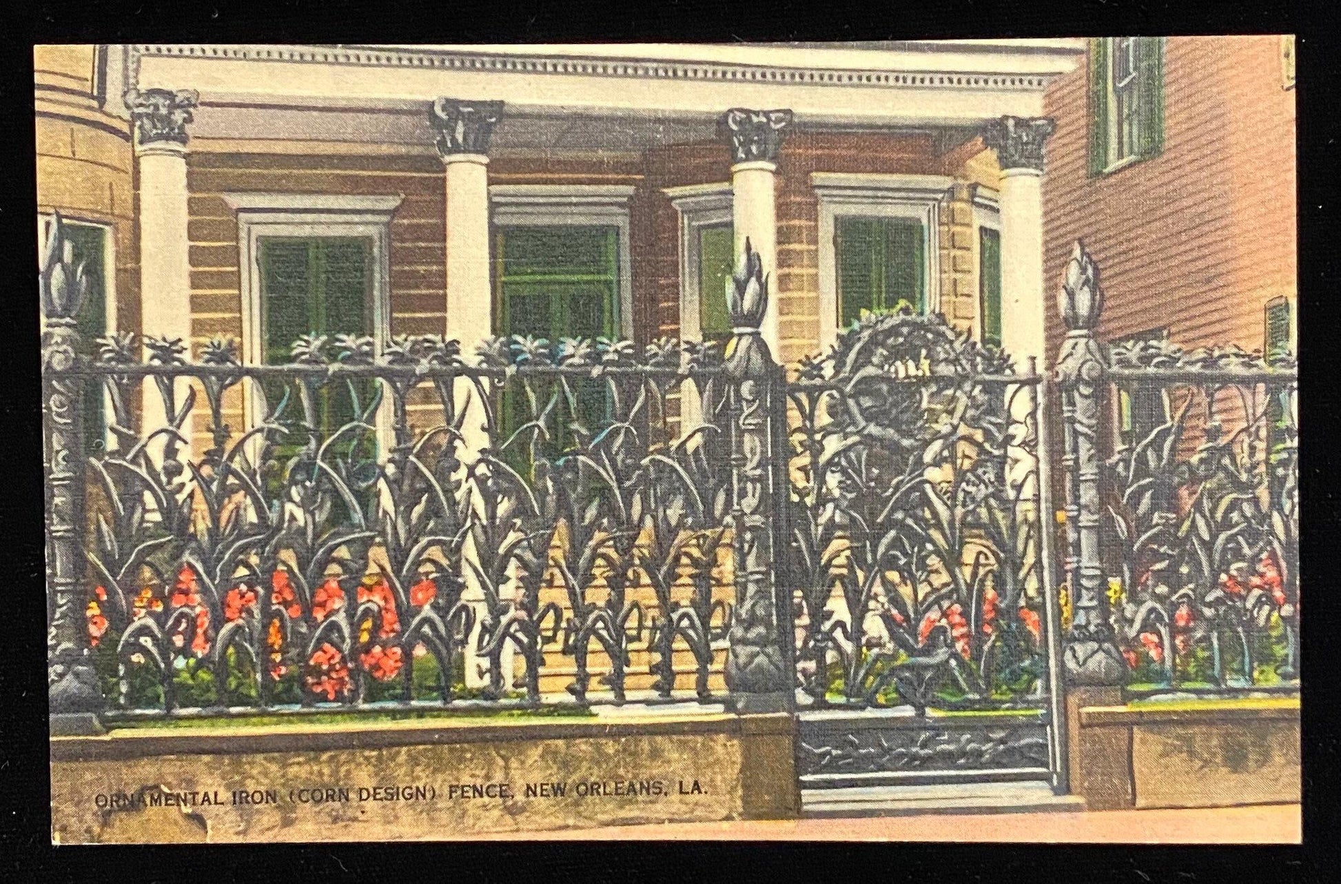 Ornamental Iron (Corn Design) Fence - New Orleans, Louisiana - 1940s Linen Postcard