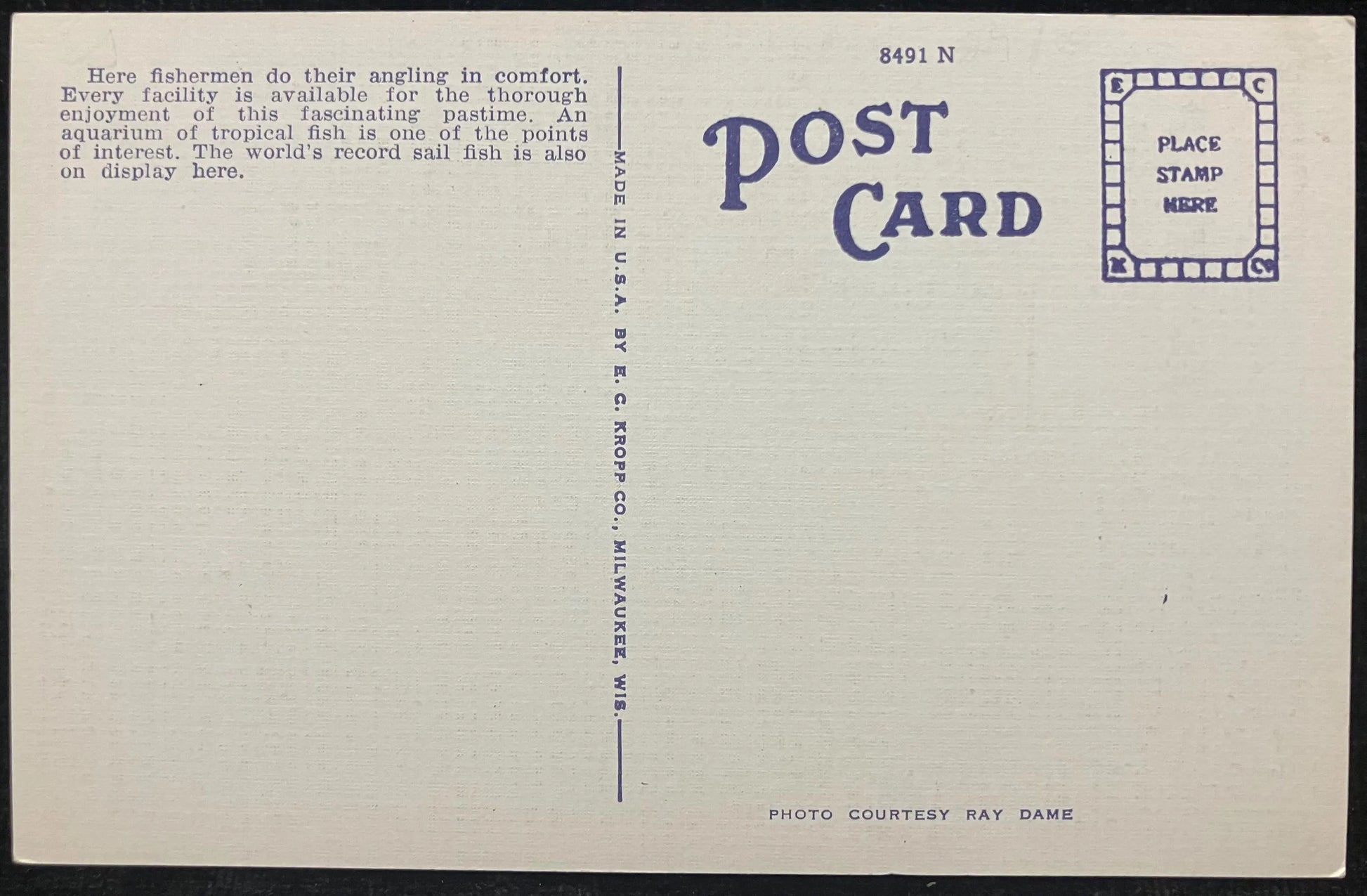 Back: Here fishermen do their angling in comfort. Every facility is available for the thorough enjoyment of this fascinating pastime. An aquarium of tropical fish is one fo the points of interest. The world’s record sail fish is also on display here.