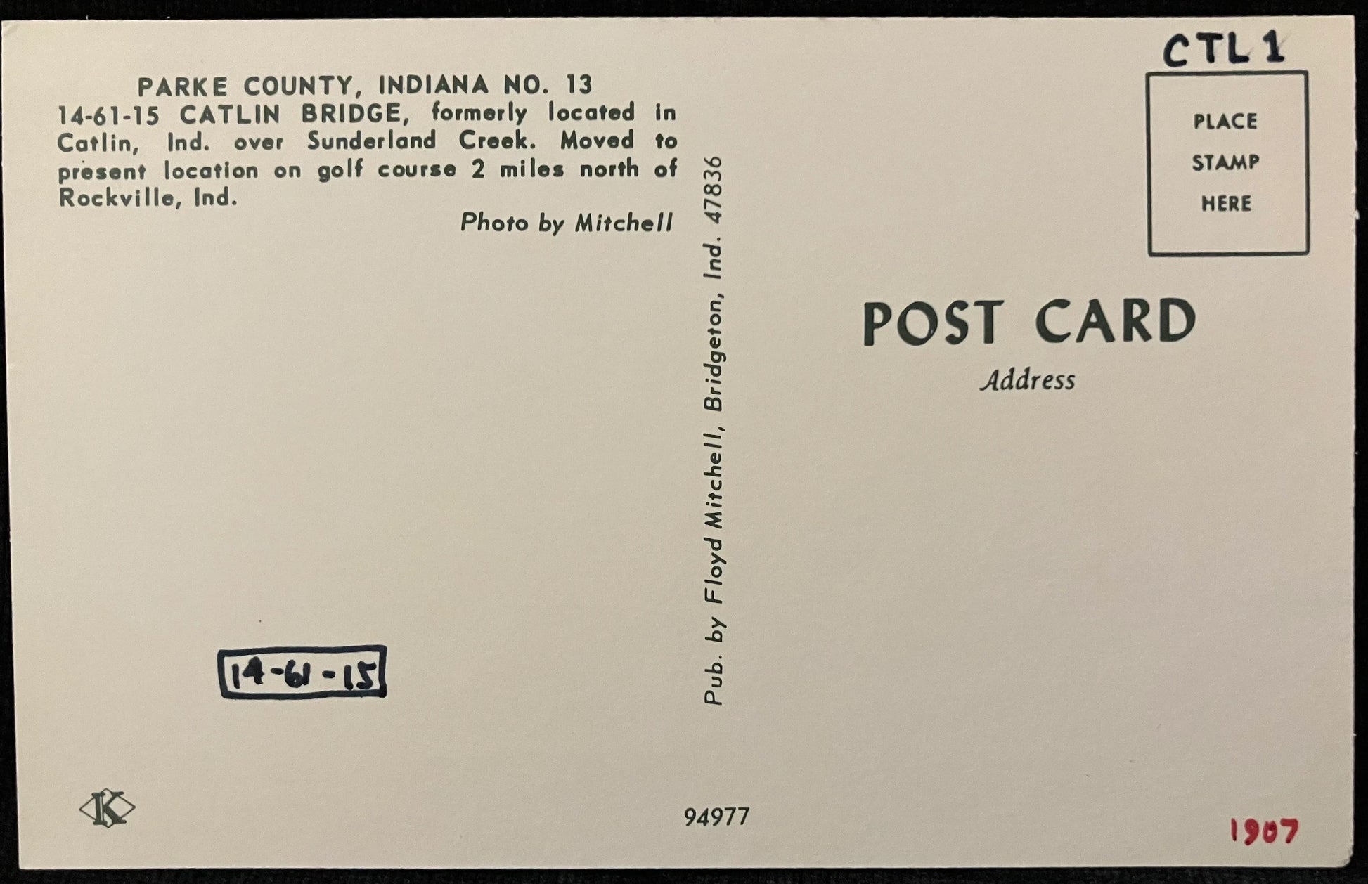 On back: PARKE COUNTY, INDIANA NO. 13 14-61-15 CATLIN BRIDGE, Formerly located in Catlin, Ind. over Sunderland Creek. Moved to present location on golf course 2 miles north of Rockville, Ind.