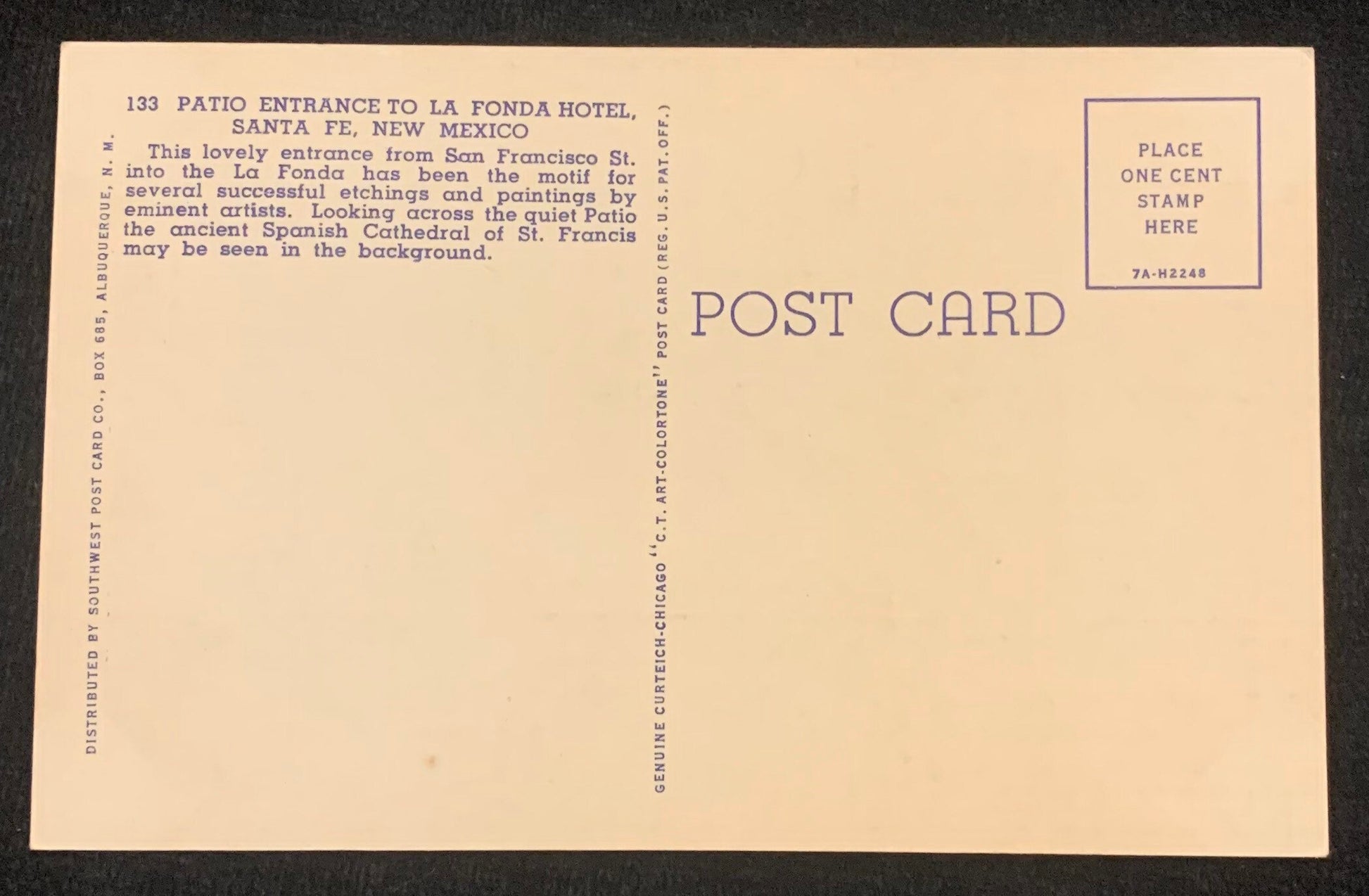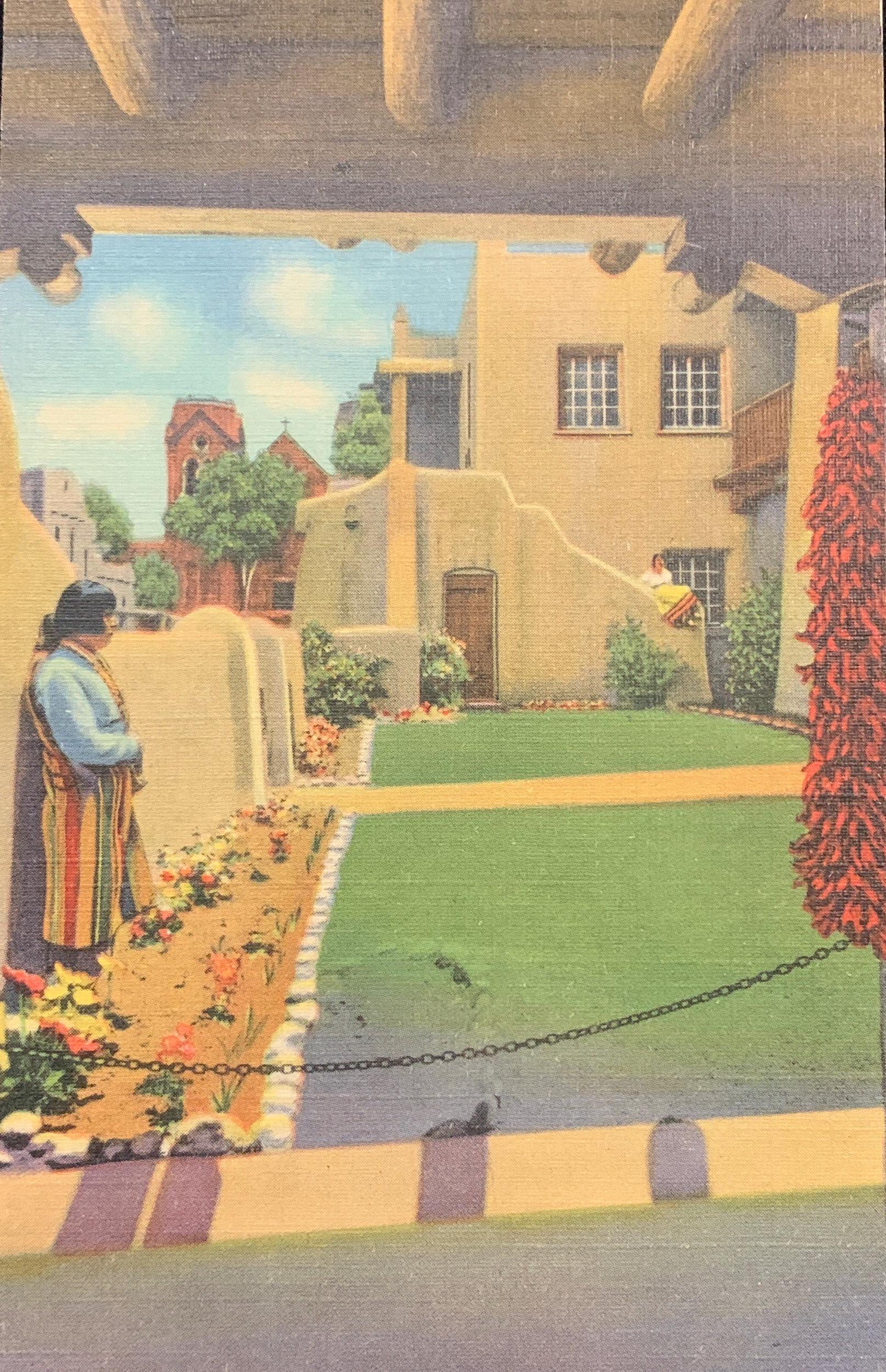 Back: This lovely entrance from San Francisco St. into the La Fonda has been the motif for several successful etchings and paintings by eminent artists. Looking across the quiet Patio the ancient Spanish Cathedral of St. Francis may be seen in the background.