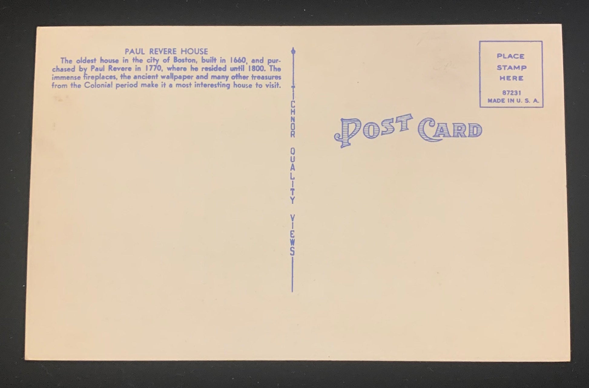 Back: The oldest house in the city of Boston, built in 1660, and purchased by Paul Revere in 1770, where he resided until 1800. The immense fireplaces, the ancient wallpaper and many other treasures from the Colonial period make it a most interesting house to visit.