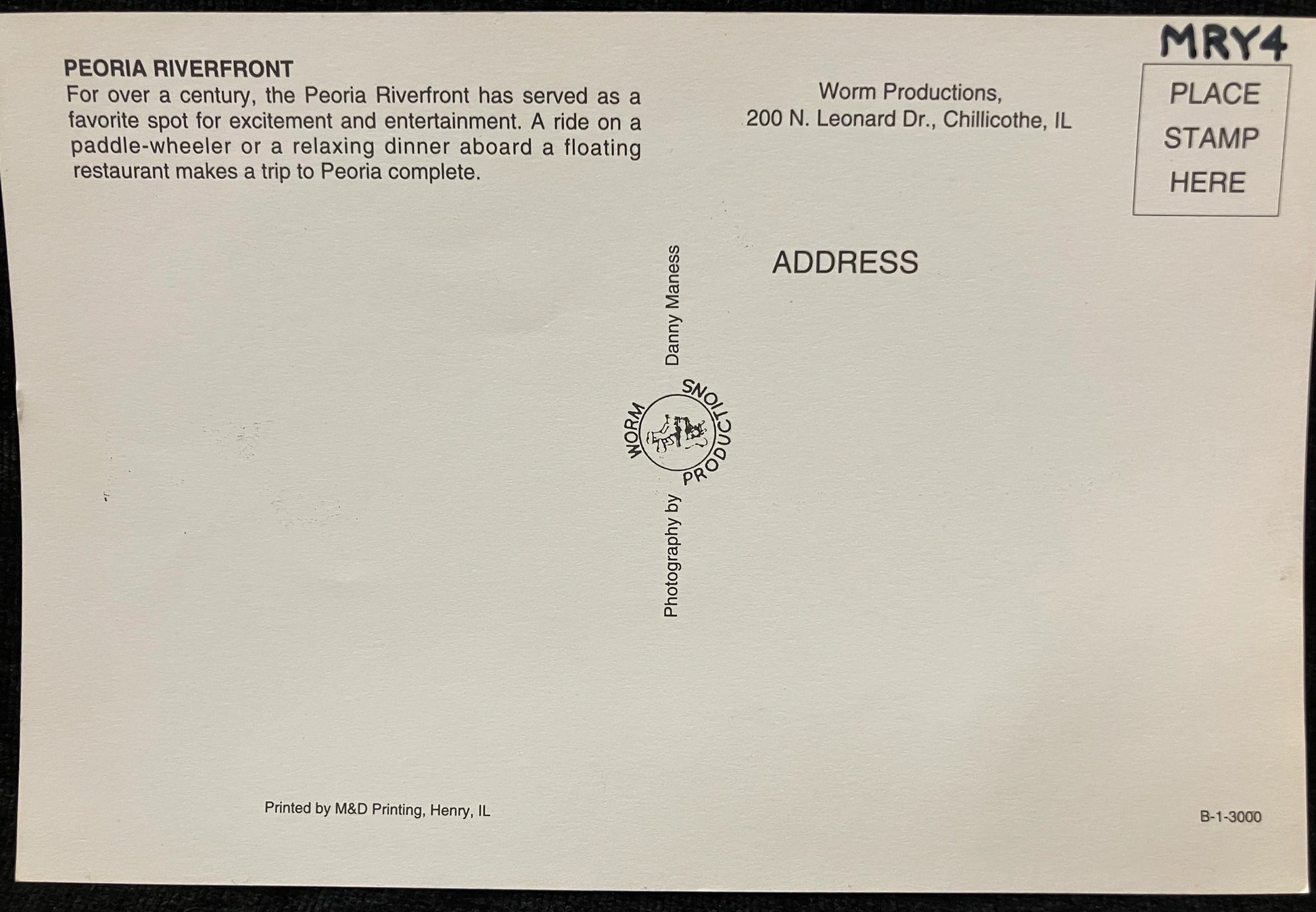 Back: Peoria Riverfront For over a century, the Peoria Riverfont has served as a favorite spot for excitement and entertainment. A ride on a padddle-wheeler or a relaxing dinner aboard a floating restaurant makes a trip to Peoria complete.