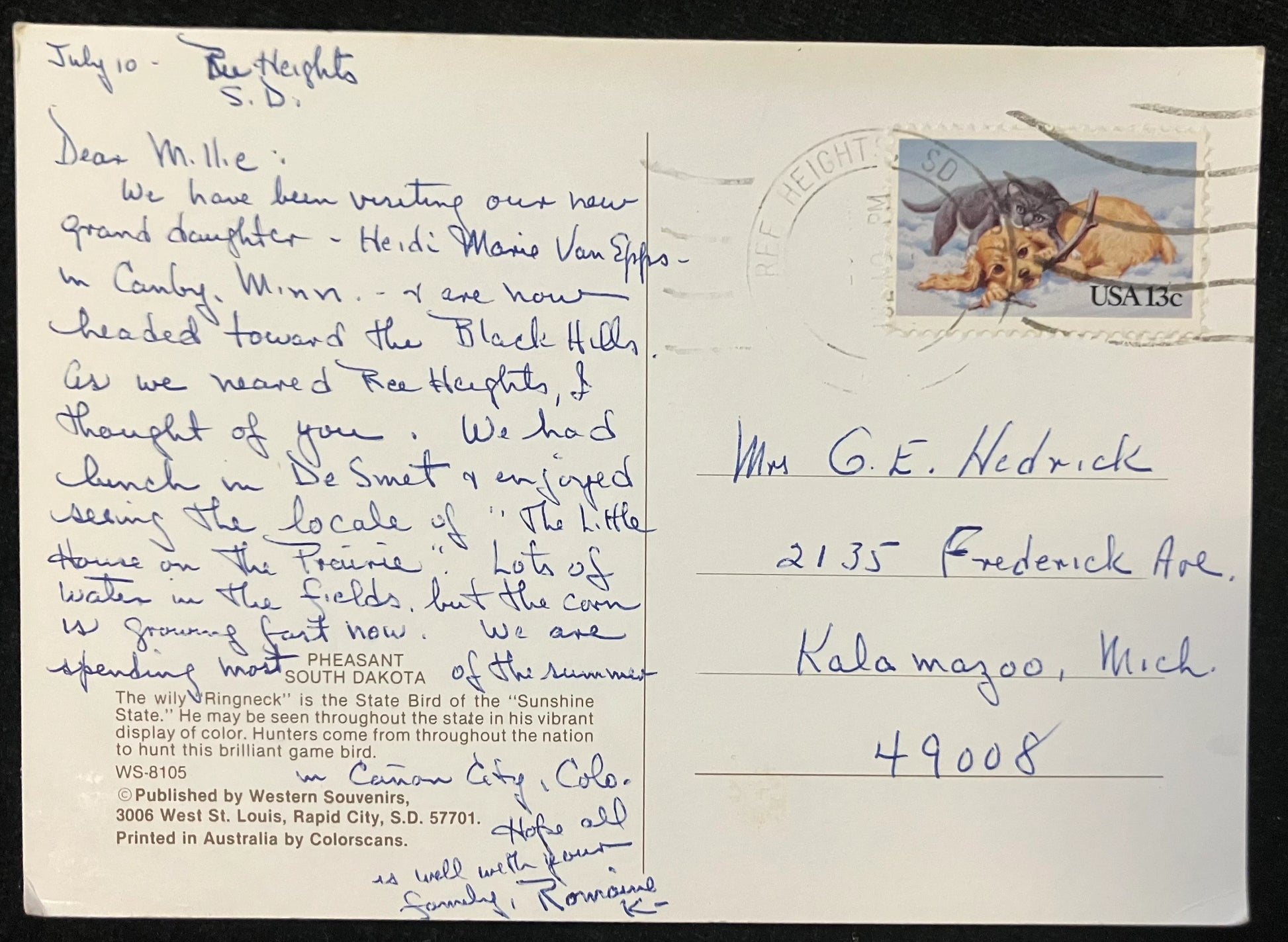 Mailed: Postmark on July 10 frim Ree Heights, South Dakota in some year from South Dakota with a thirteen cent USA stamp