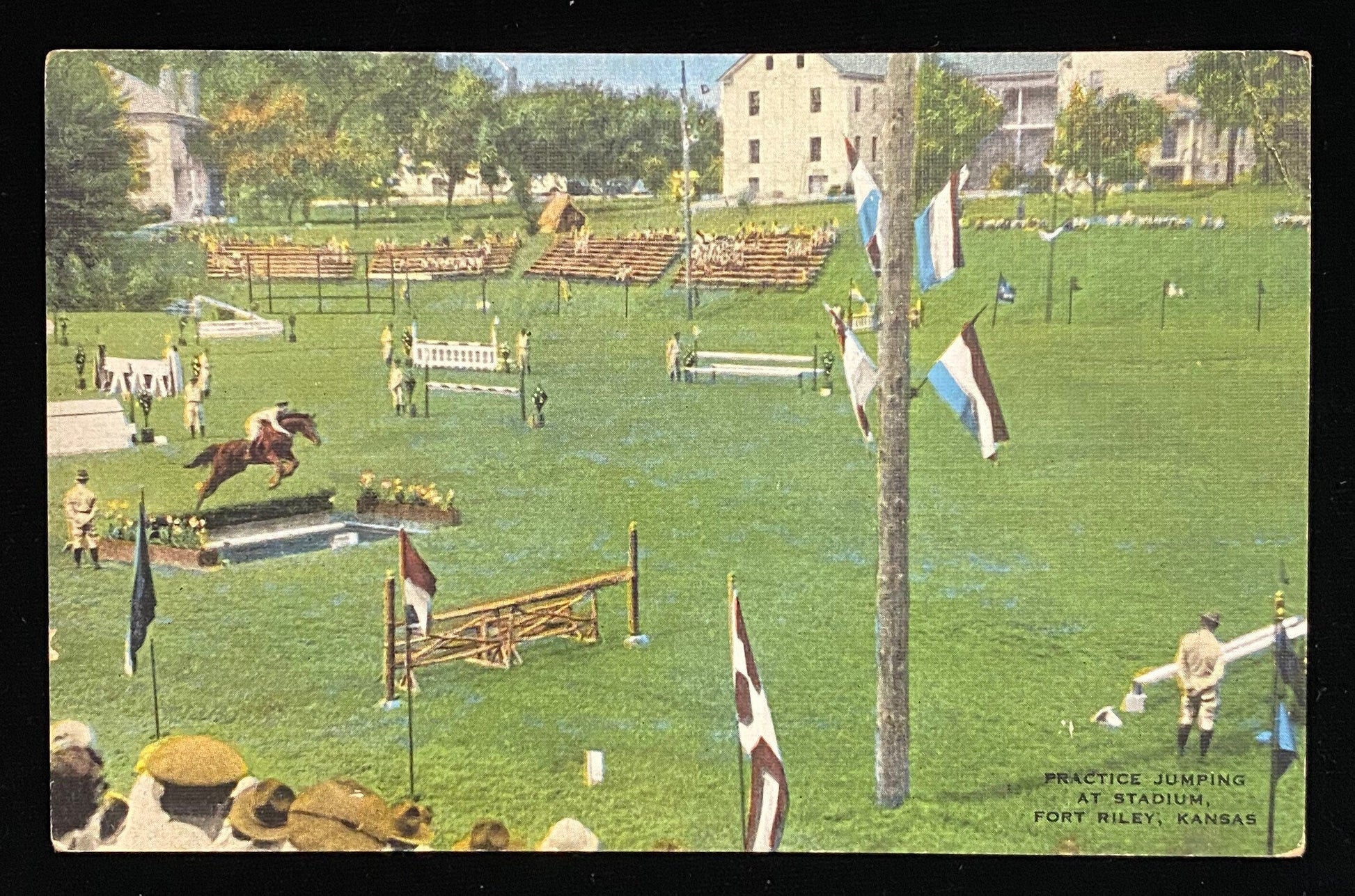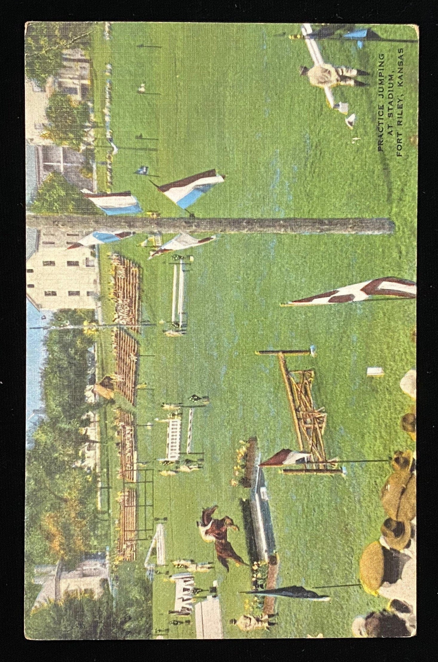 Practice Jumping at Stadium - Fort Riley, Kansas - 1940s Linen Postcard