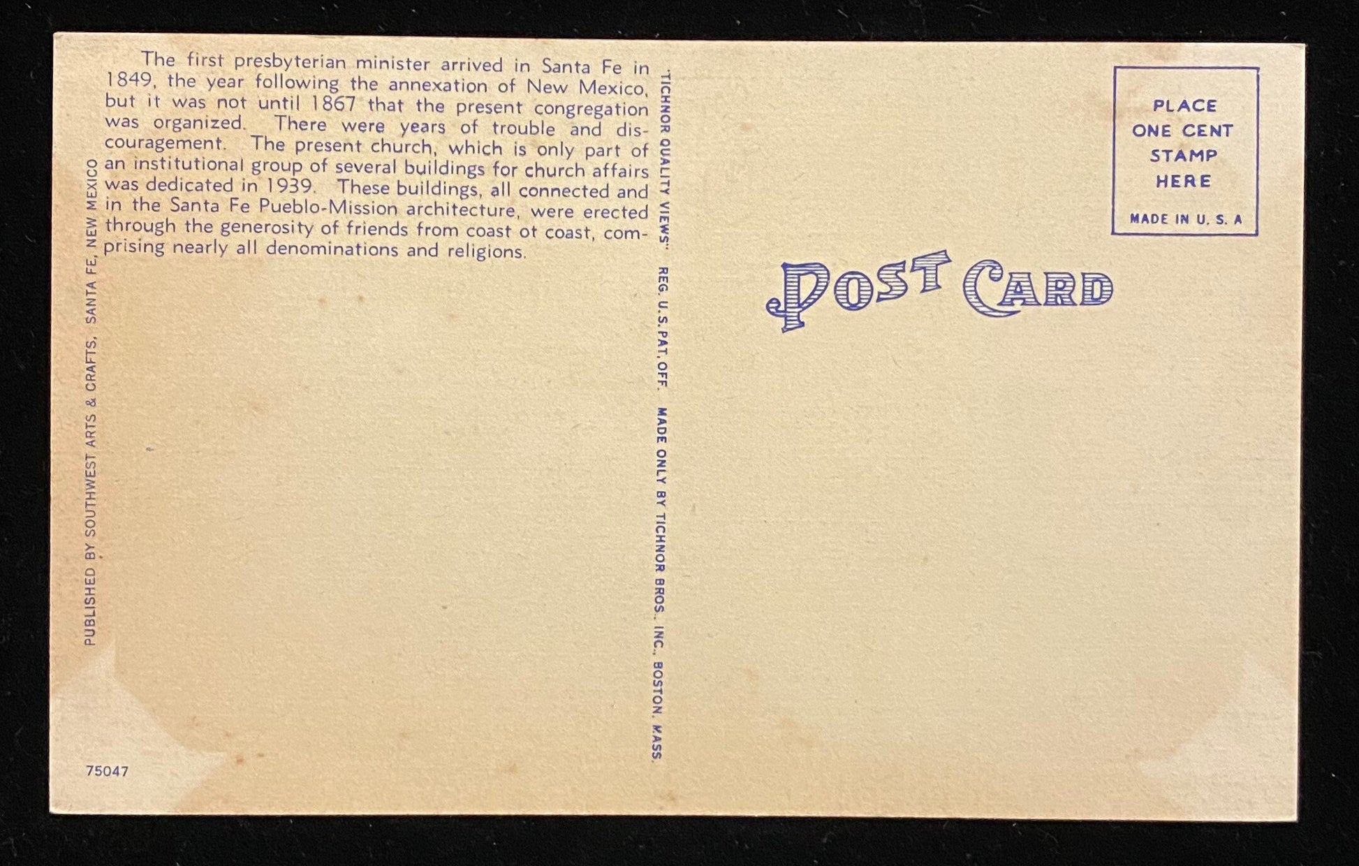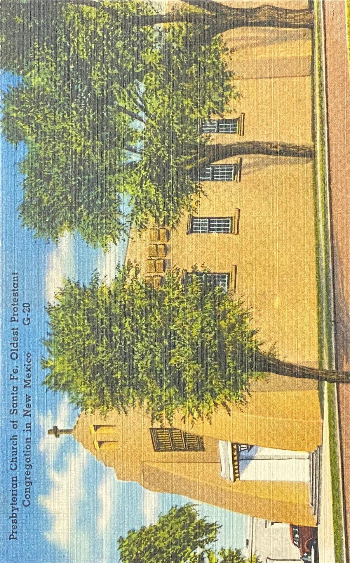 Back Information: "The first Presbysterian minister arrived in Santa Fe in 1849, the year following the annexation of New Mexico, but it was not until 1867 that the present congregation was organized. There were years of trouble and discouragement. The present church, which is only part of an institutional group of several buildings for church affairs was dedicated in 1939. These buildings all connected and in the Santa Fe Pueblo-Mission architecture, were erected through the generosity of friends from coast of coast, comprising nearly all denominations and religions."