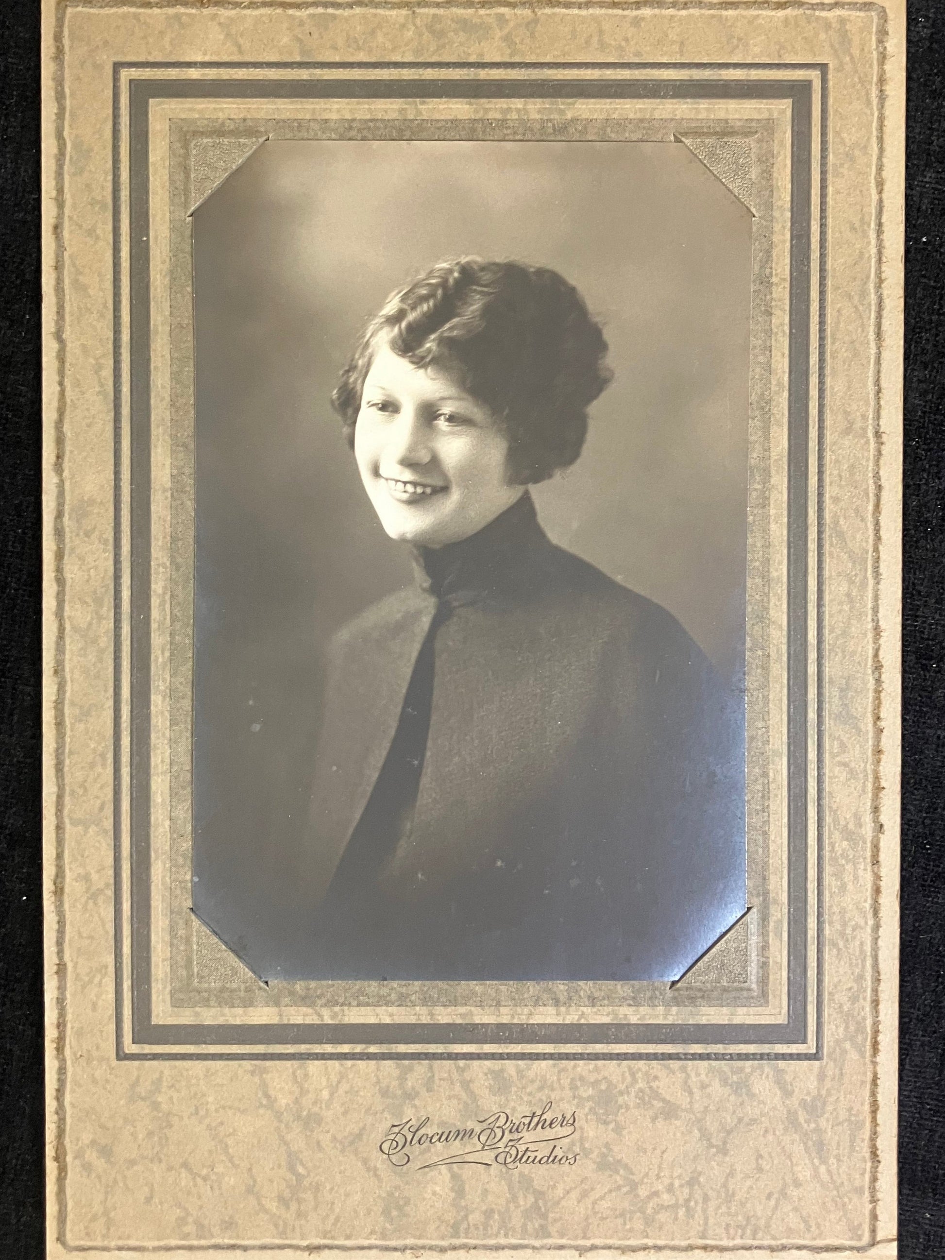 This lovely black-and-white photo features a smiling woman wearing a cape and sporting an elegant haircut. Taken by Slocum Brothers Studio in Kalamazoo, Michigan, this photographic folder likely commemorated her graduation from either of the two Kalamazoo universities -- Western Michigan University or Kalamazoo College -- both of which admitted female students much earlier than their Ivy League counterparts. Perfect for a history or women's studies grad.