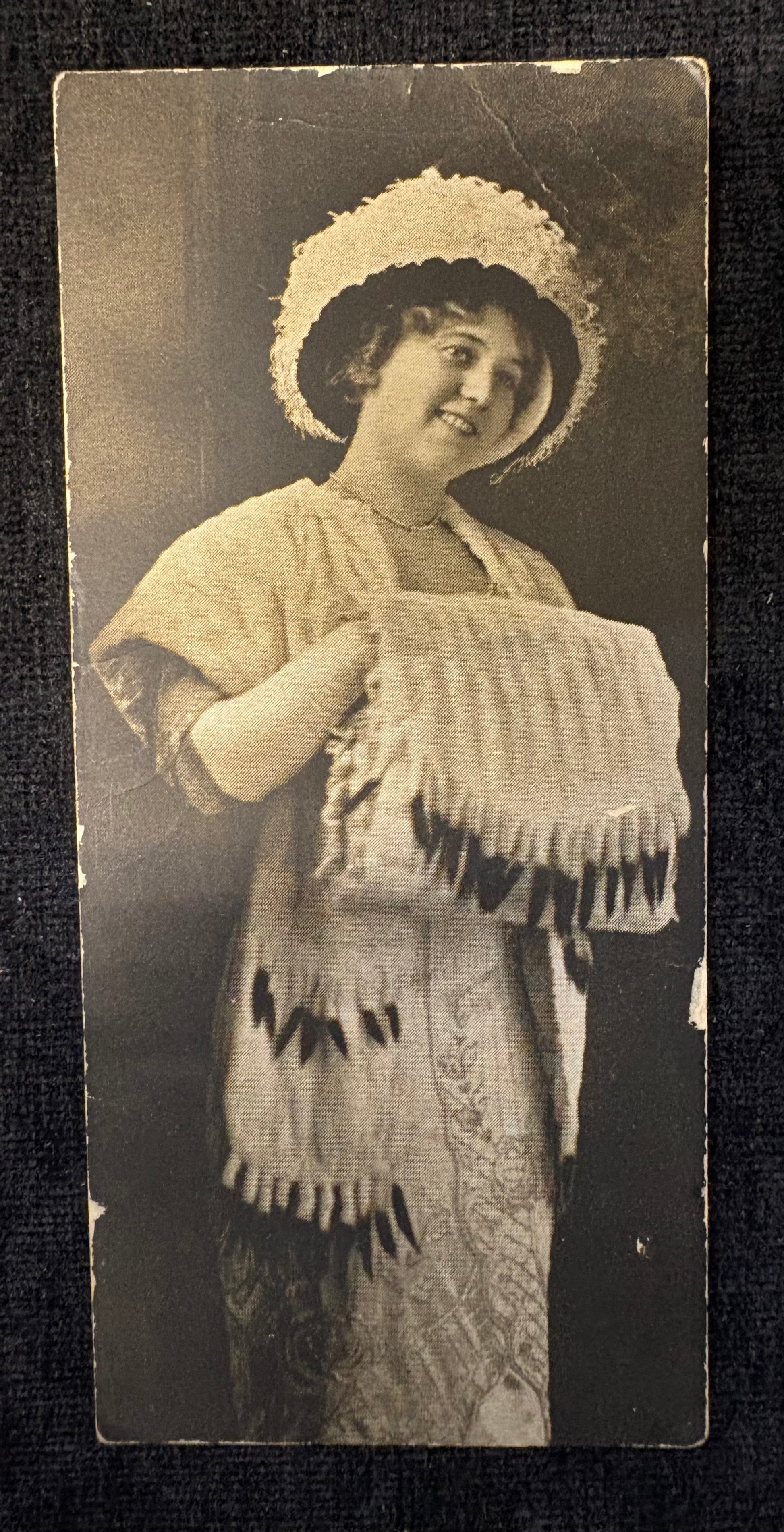 This woman is covered in feathers from head to toe! Perhaps a prominent actress or fashion-forward socialite, she displays the opulent animal pelt styles of late Victorian fashion. Her curls and makeup remind me of an early-20th century actress, like Dorothy Sebastian or Marion Aye!