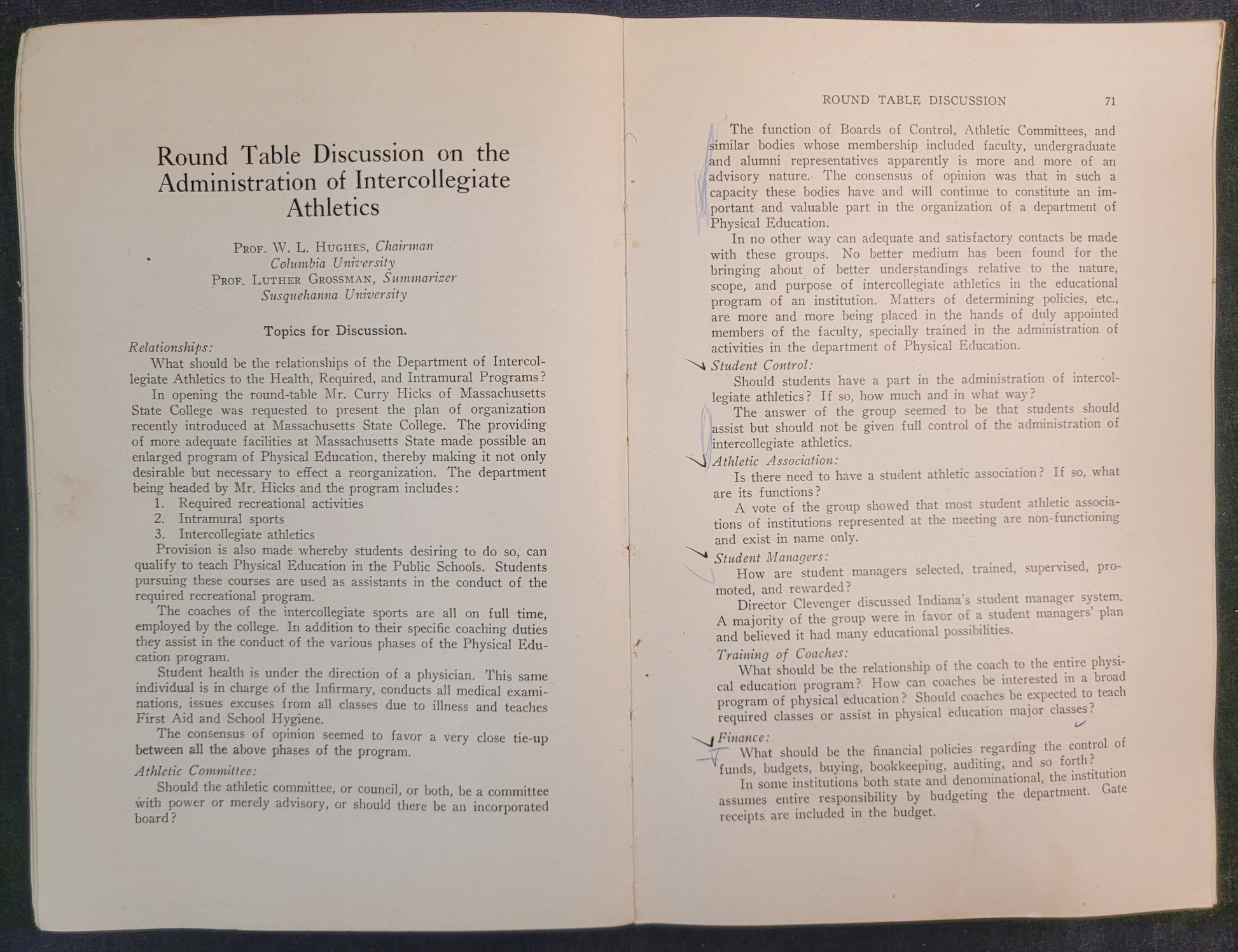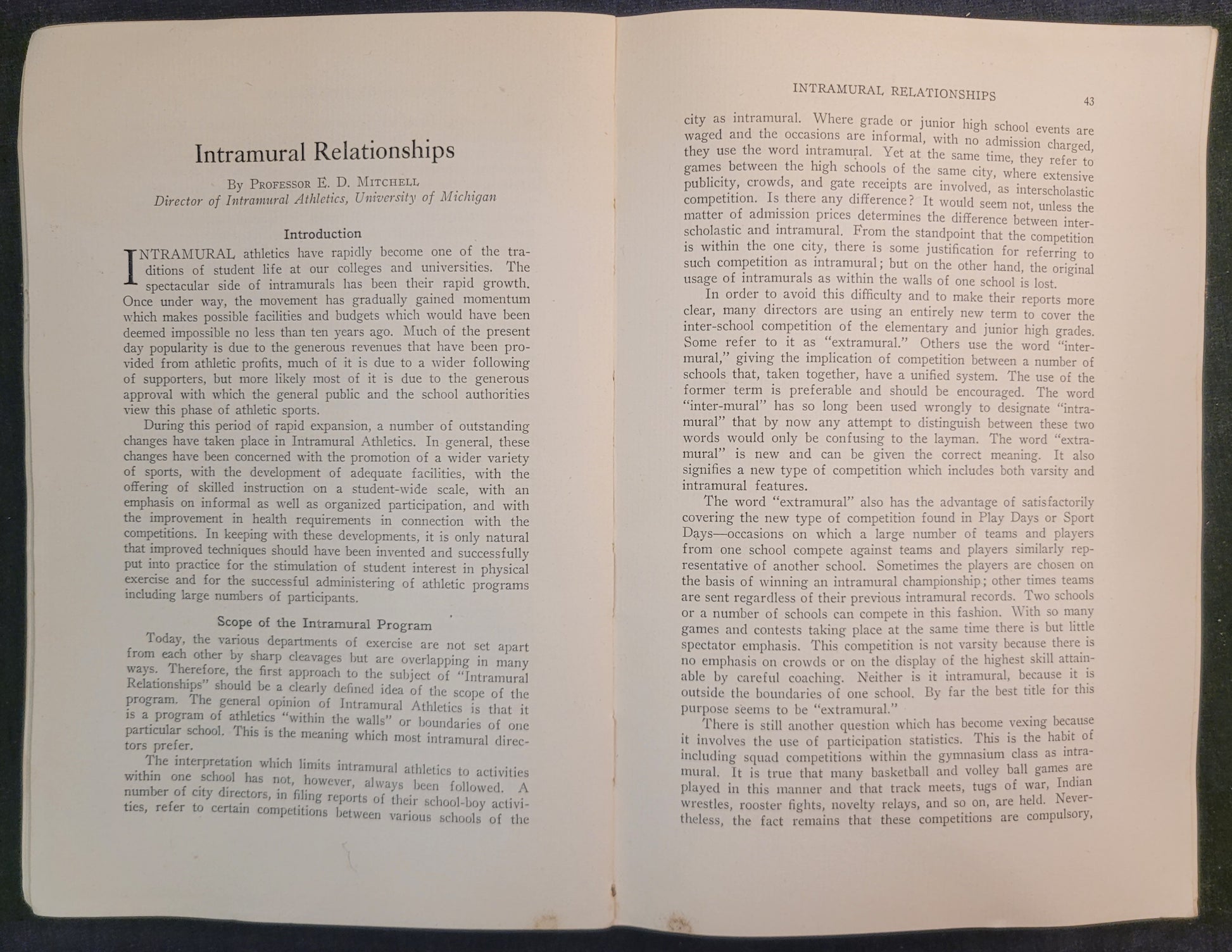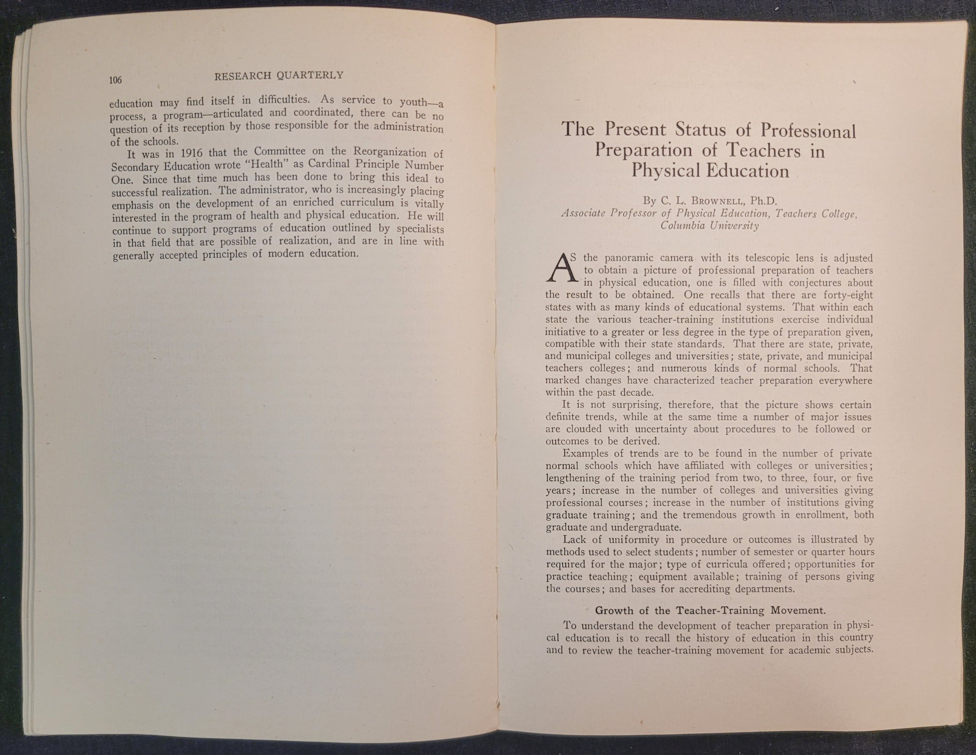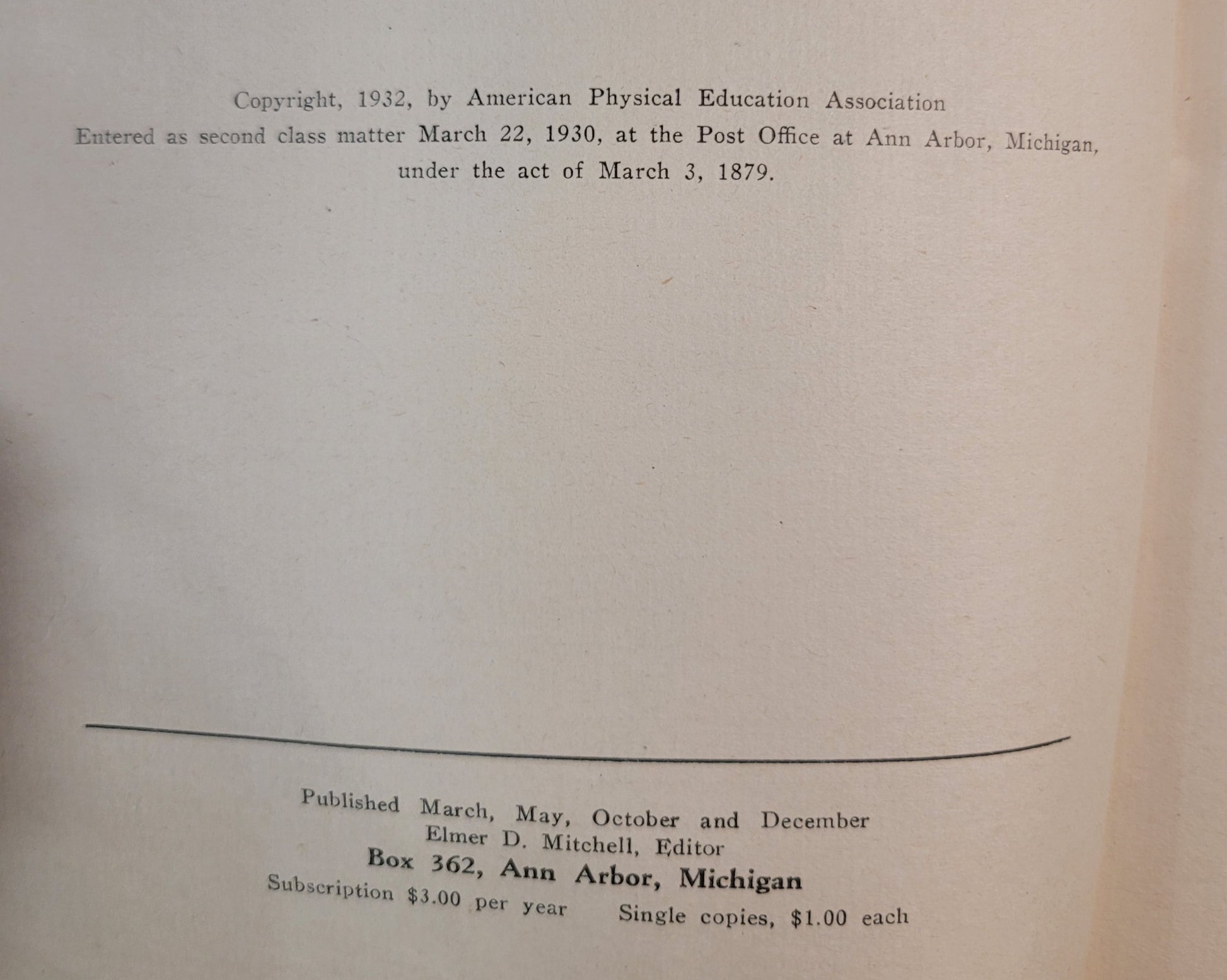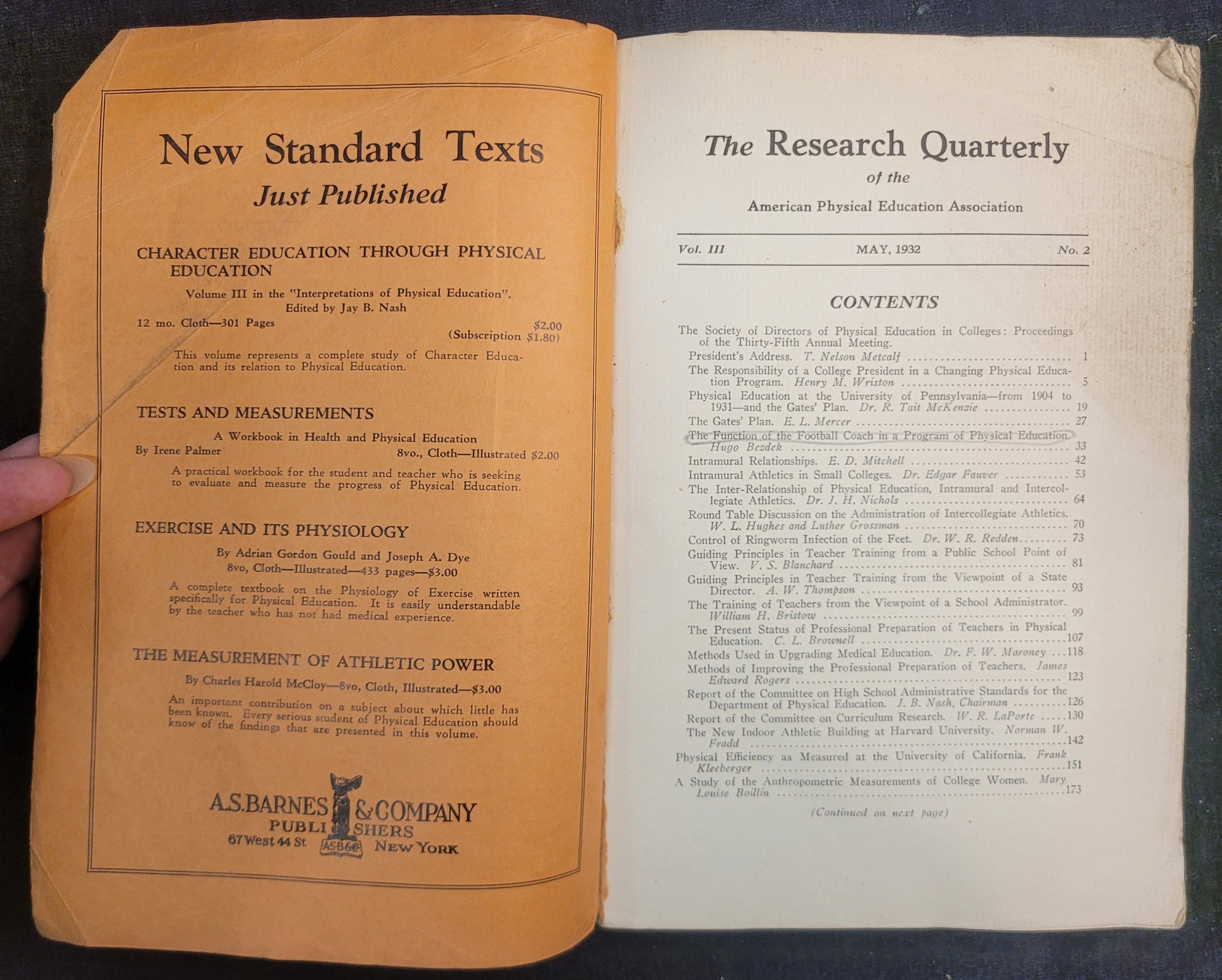 This book is an early publication of research in the field of physical education, exercise and sport. Included in this edition are a range of topics, spanning general updates in the PE world to personality traits of PE majors in college, to book reviews. This publication is in fairly good condition, showing obvious signs of use including staining, discoloration and fraying.