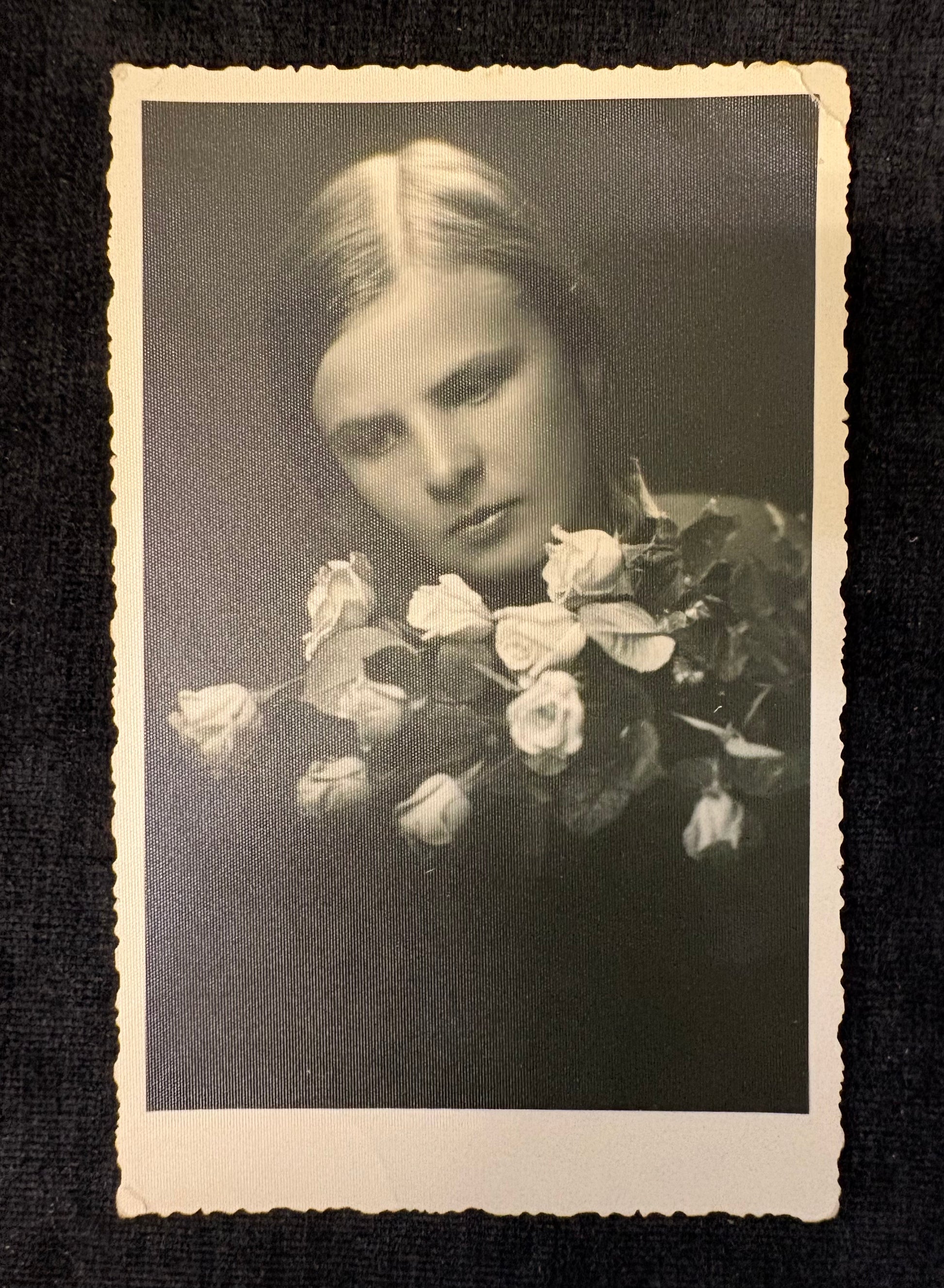 This beautiful photo of a young woman gazing at white roses is a real photo postcard from Latvia, though it was unmailed and likely used as a keepsake. She looks somberly, or pensively, down at the bouquet, which sits at the very center of the postcard. The light shines from above and the bottom half of the postcard is dark, giving the woman a heavenly glow.