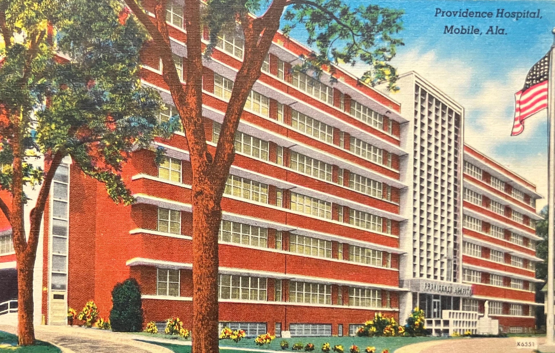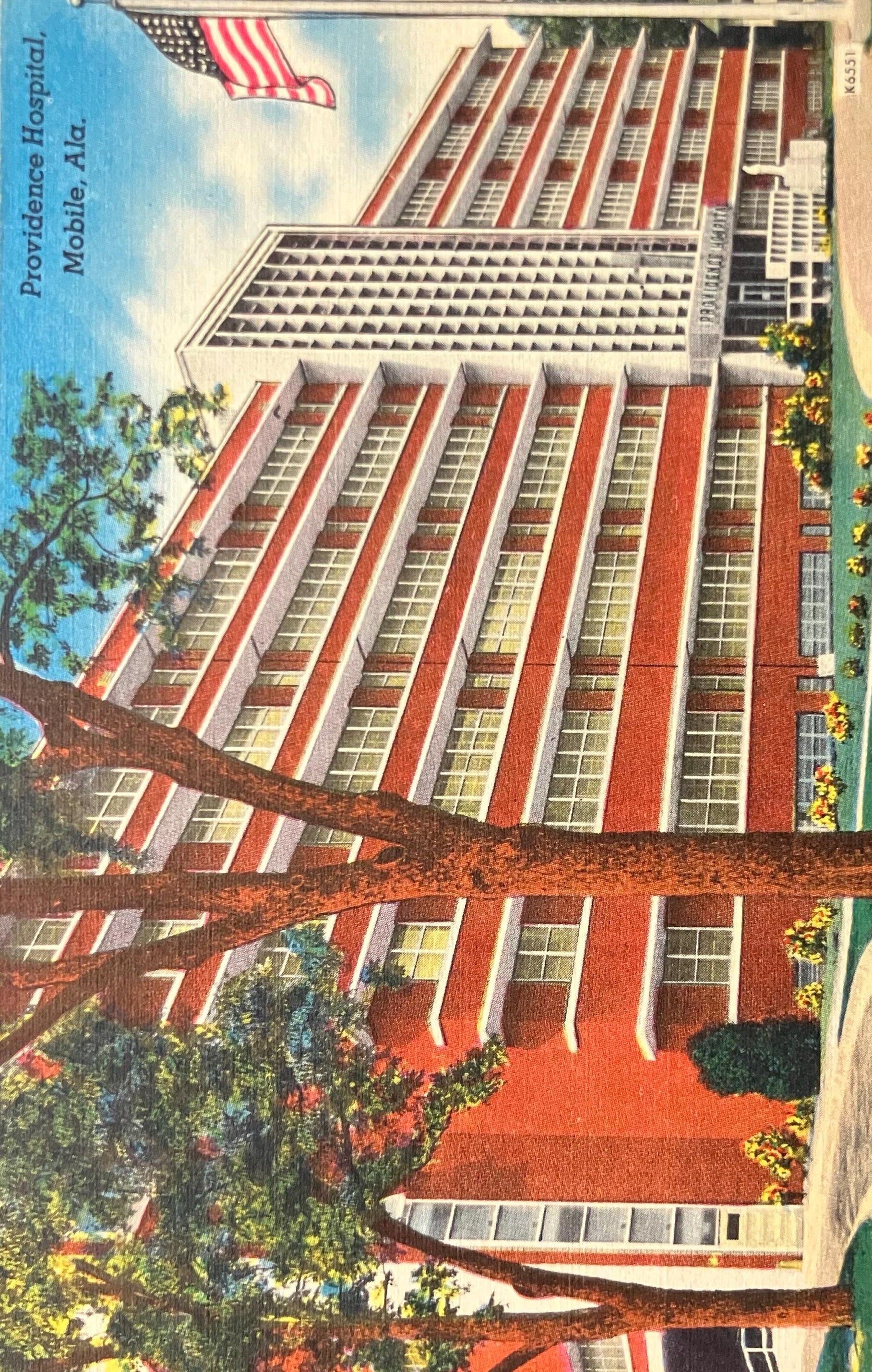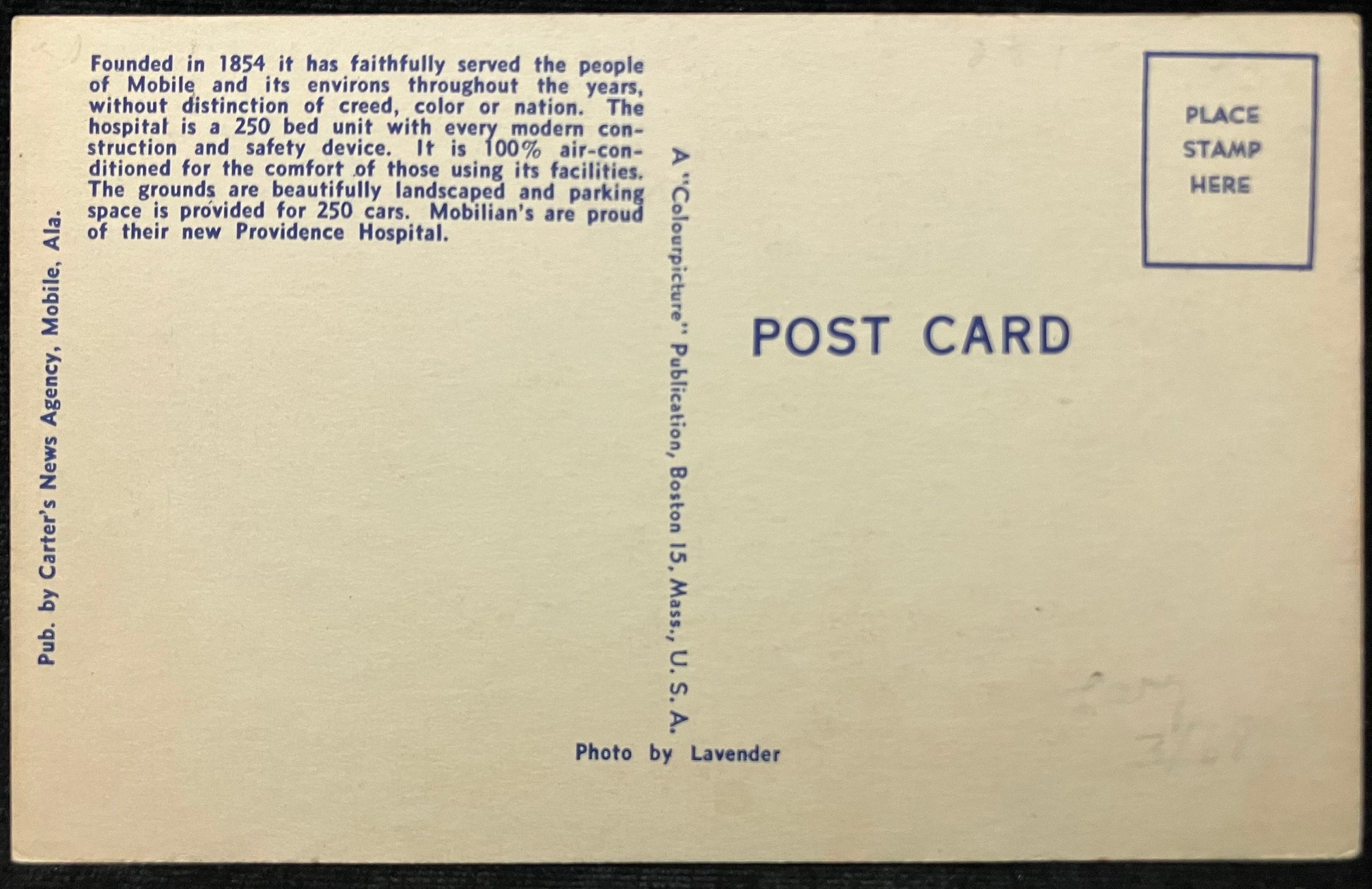 On back: Founded in 1854 it has faithfully served the people of Mobile and its environs throughout the years, without distinction of creed, color or nation. The hospital is 250 bed unit with every modern construction and safety device. It is 100% air-conditioned for the comfort of those using its facilities. The grounds are beautifully landscaped and parking space is provided for 250 cars. Mobilian’s are proud of their new Providence Hospital.