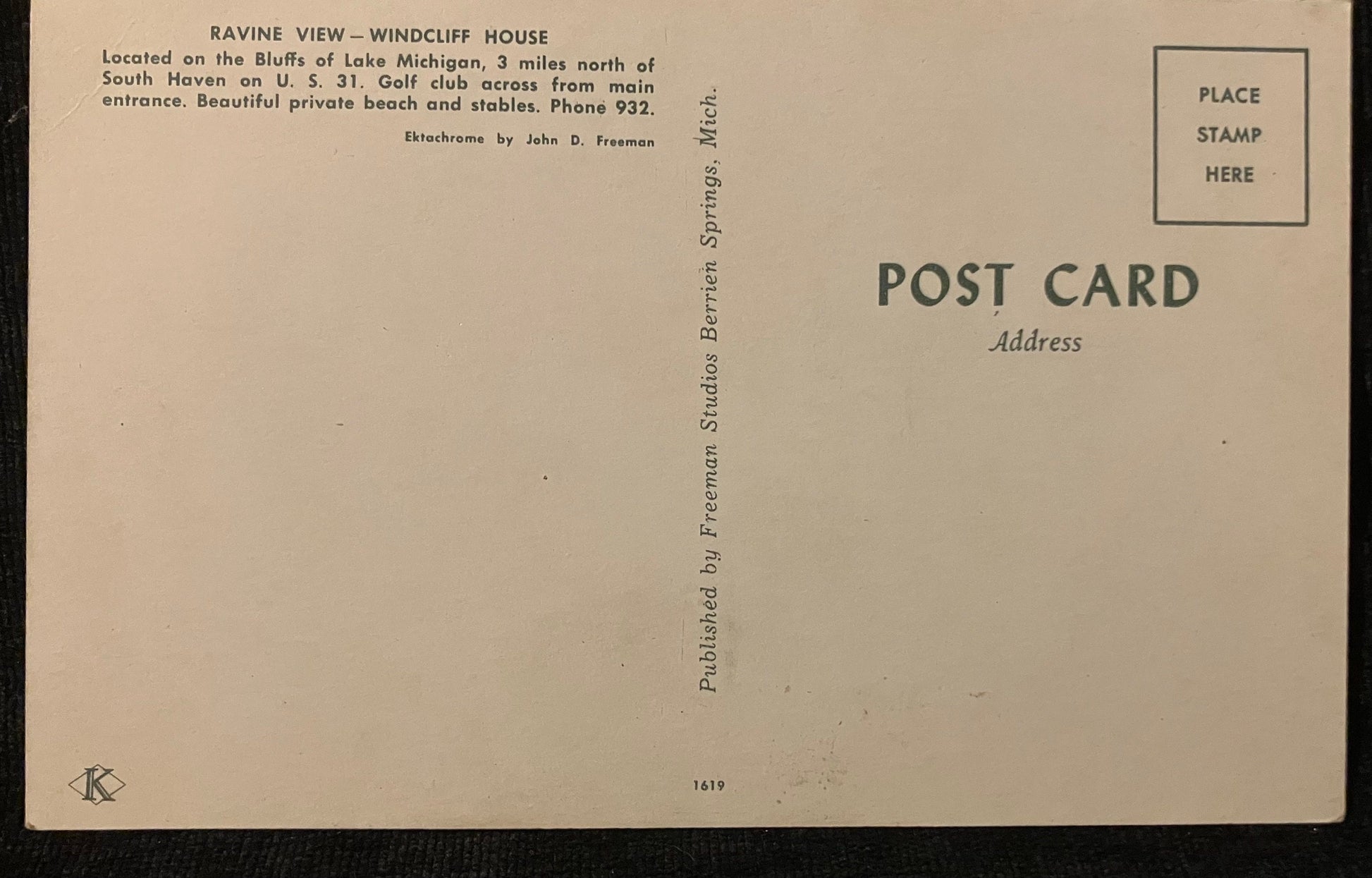 On back: Ravine View - Windcliff House Located on the Bluffs of Lake Michigan, 3 miles north of South Haven on U. S. 31. Golf club across from main entrance. Beautiful private beach and stables.