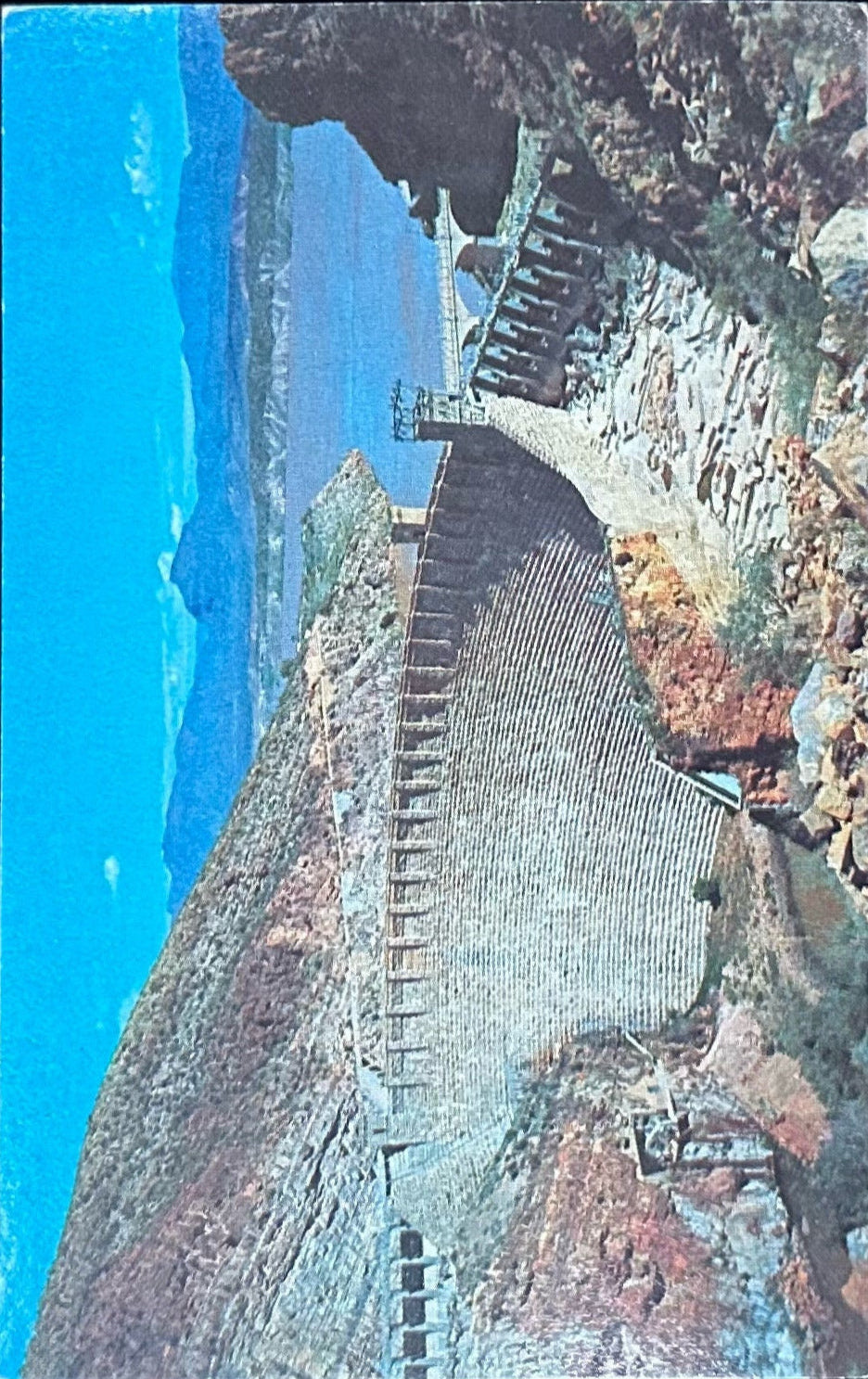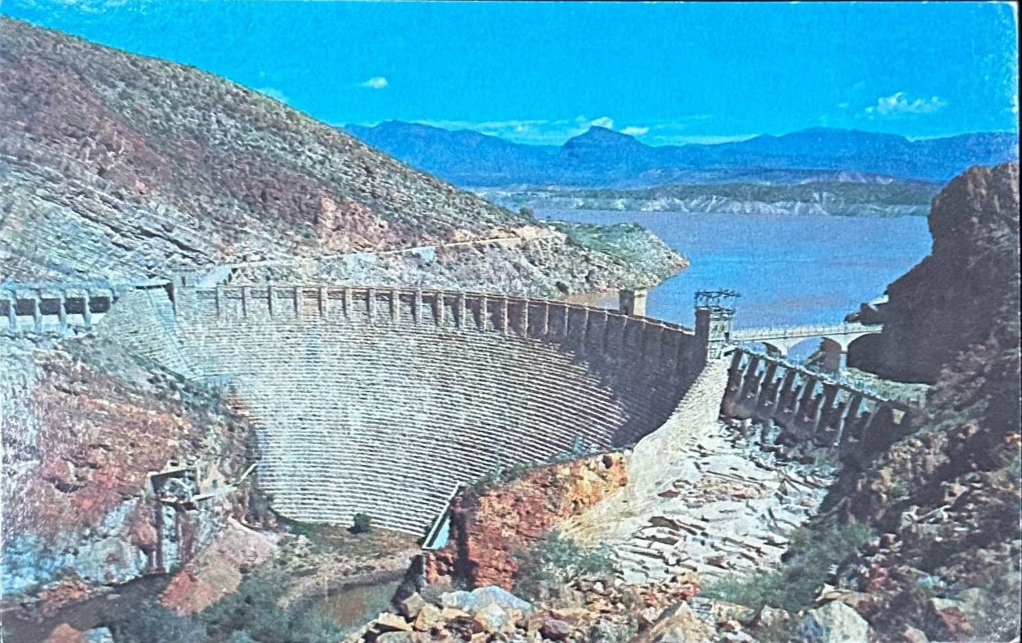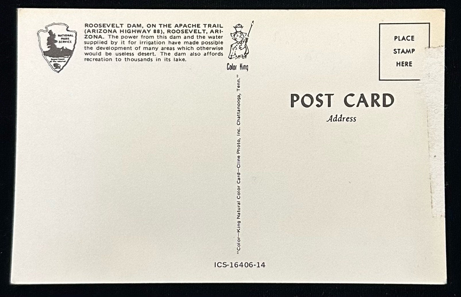 Back Information: Roosevelt Dam, on the Apache Trail (Arizona Highway 88), Roosevelt, Arizona - The power from this dam and the water supplied by it fro irrigation have made possible the development of many areas which otherwise would be useless desert. The dam also affords recreation to thousands in its lake.