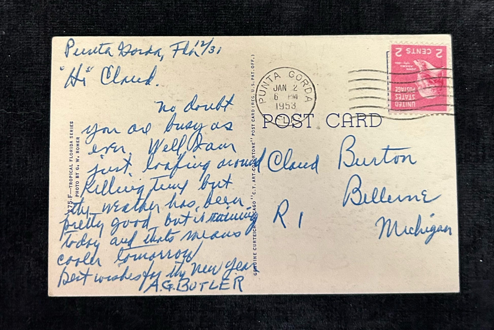 275 F- Tropical Florida Series, Photo by G. W. Romer. Posted from Punta Gorda, Florida to Belleine, Michigan.