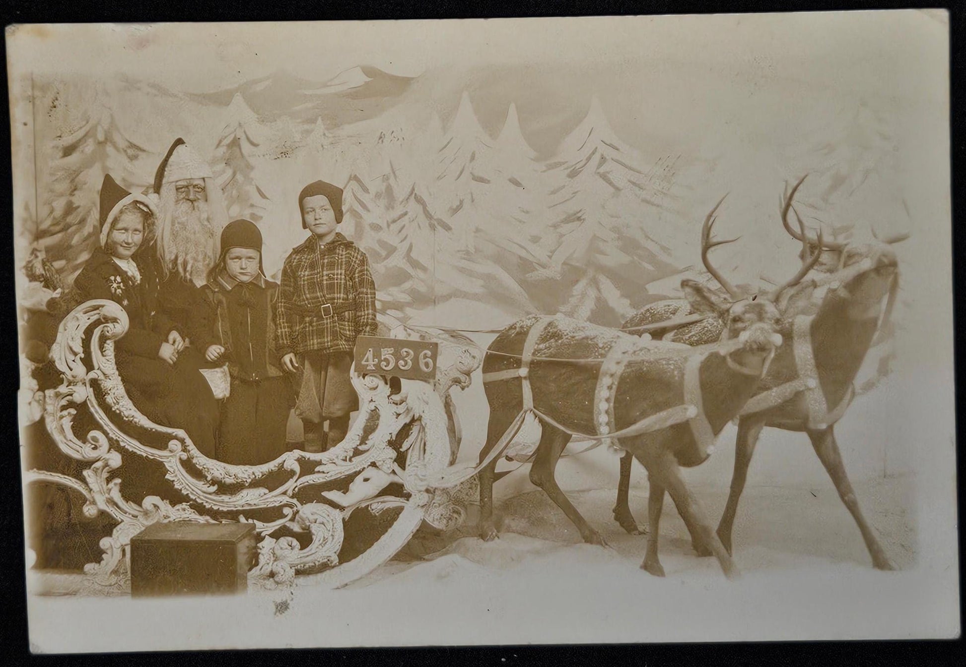 This is an RPPC which is nostalgic and historical. At this period in time, the US Post offices offered Holiday Photos for Post cards as a free service to encourage mailing items to family and friends. This Photo has so many details and must have been taken in a big city, as the number indicates it is photo 4536, and obviously, a family Christmas photo postcard. I found this very same Santa Photo Display, with a different Santa and Child, on another RPPC with the number 106492...which means more than 100,000 kids sat in this Santa Photo Backdrop that holiday season ( the Santa looks different..glad the job was shared!) The reindeer look exactly alike on both cards, maybe, they meet the local taxidermist..as they look very real! Never mailed, the family may have kept as their momento.