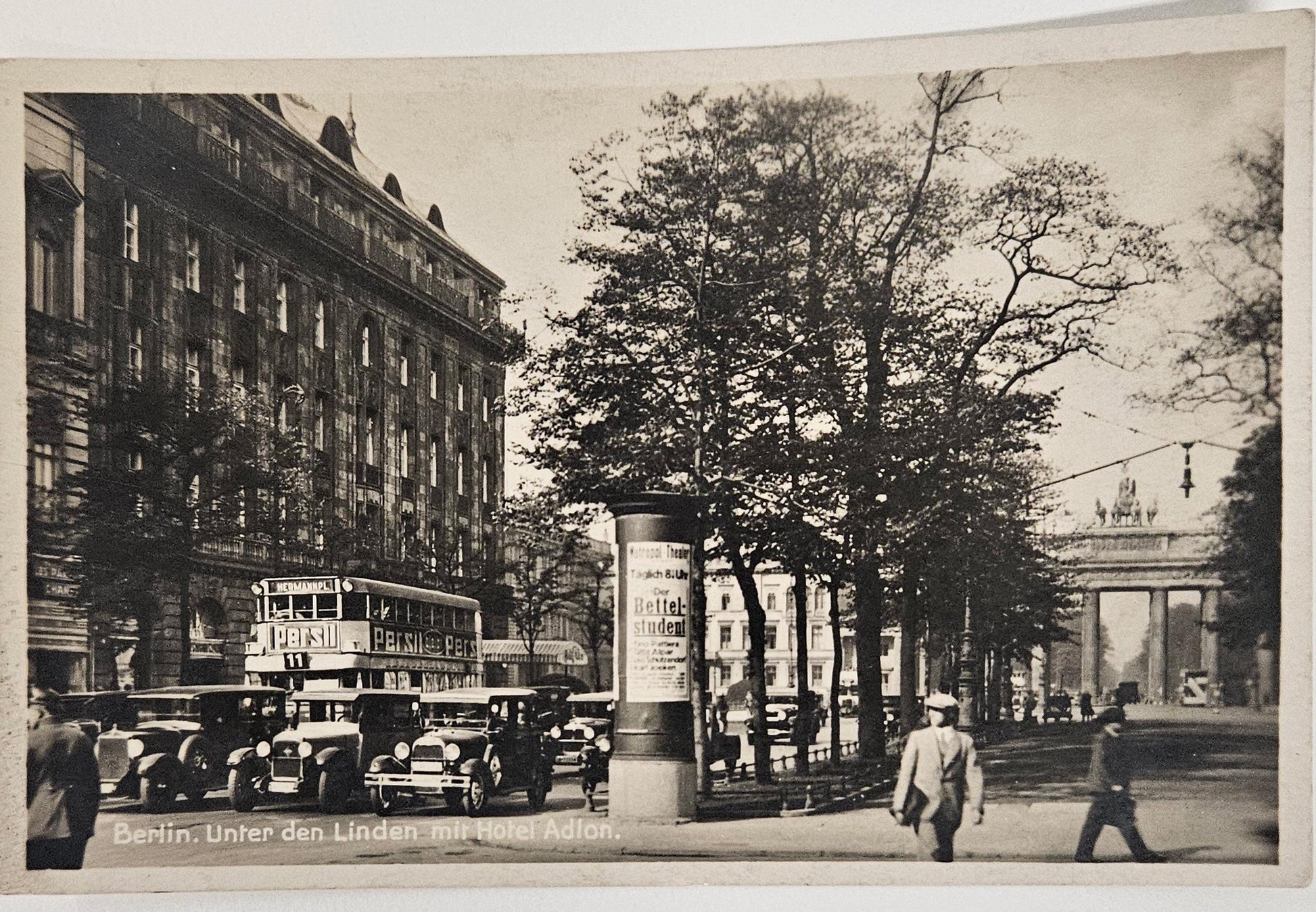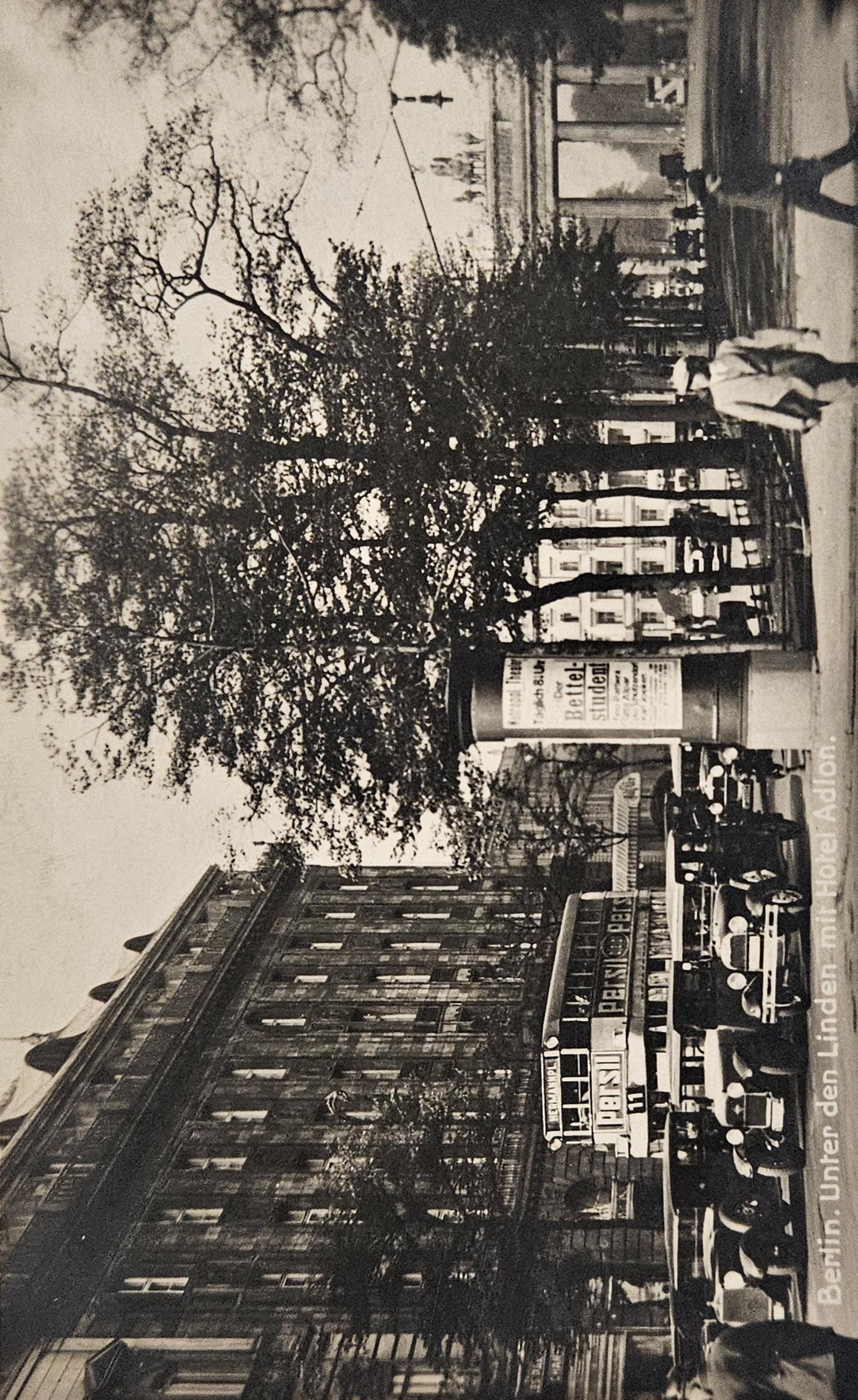 This is a pre-war photo of tranquility with Berlin's Luxury Adlon Hotel in the background. The hotel was badly damage in the bombing of Berlin during WWII, then the remainder burned down in 1946. The Avenue shown had 64 buildings to begin with, only 16 were not destroyed. The rebuilt Hotel Adlon is where Michael Jackson, infamously, dangled his son out the window.