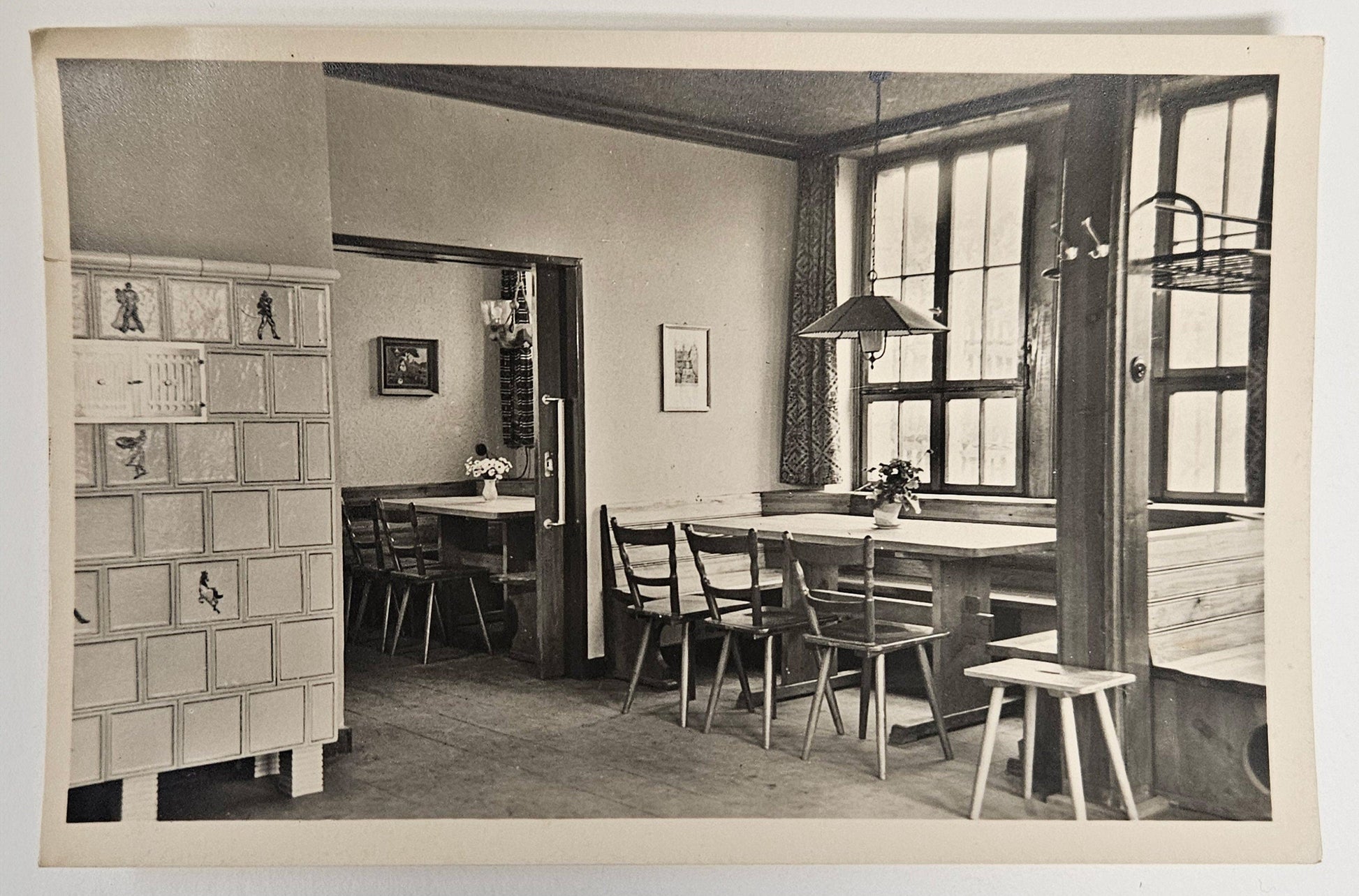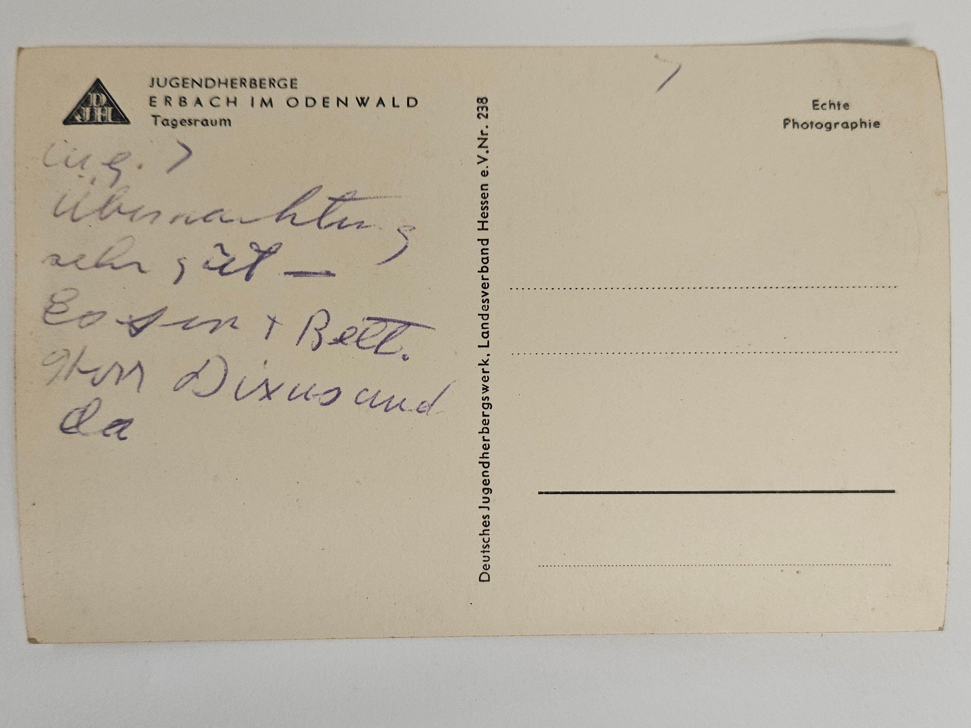 Youth Hostel in Germany with Mid Century Modern furniture made of light colored wood. Very utilitarian and sparse environment for easy clean stay overs. The card is in very good condition with a message on the back side, but no stamp, probably kept by a young person traveling and staying at Hostels. Photo about 1955.