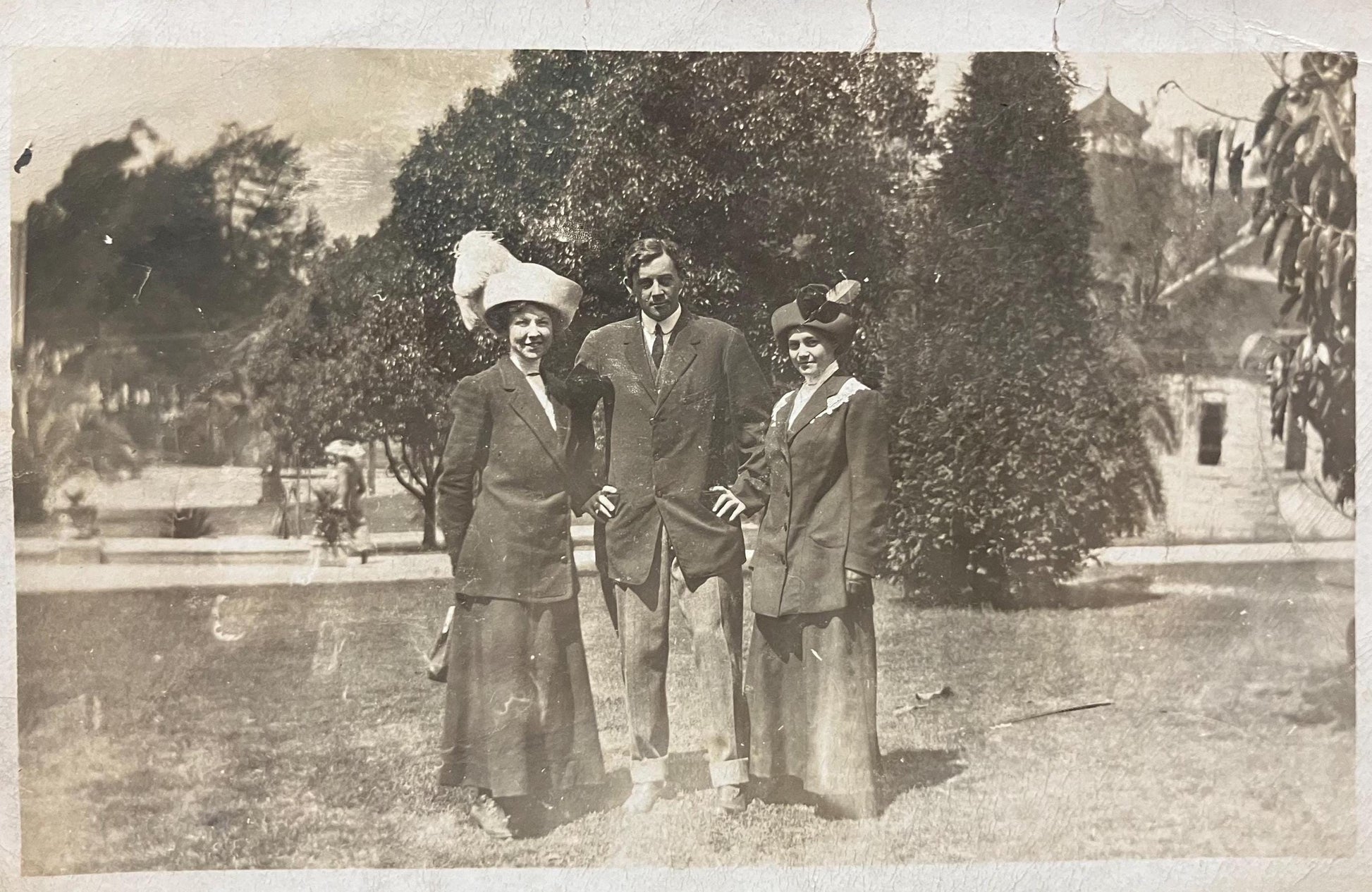 Man and Wife Posing with Daughter- Women in Feathered Hats - All Dressed up in 1910 at a Public Place - Could be Detroit or Chicago