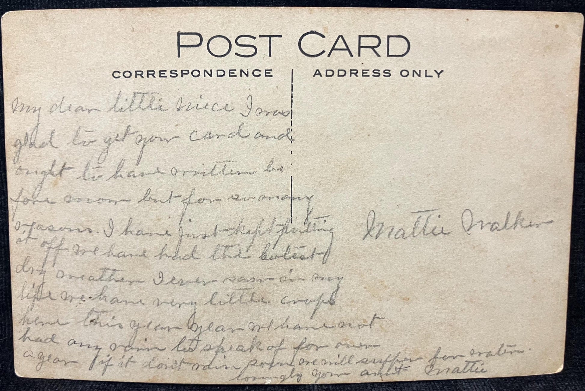 Unmailed: this card has a long message from the woman pictured. She speaks of a terribly dry season and hardly any crops. Michigan began to feel a drought coming in 1928...but the clothing here is more like worn up until 1920.