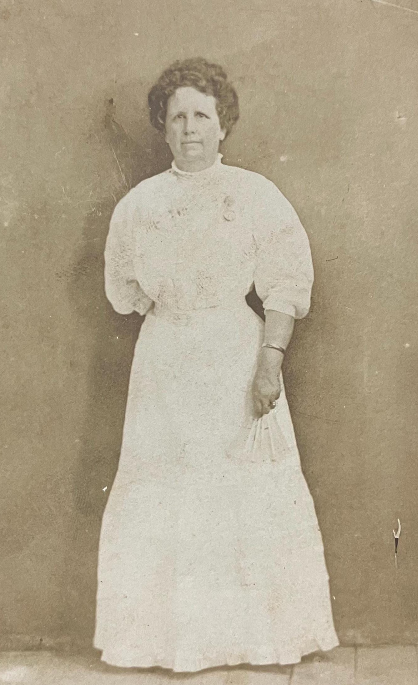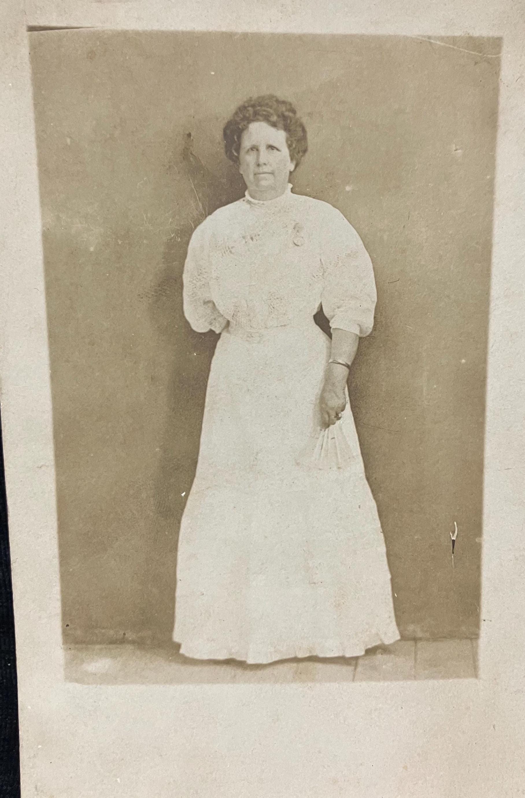 Mature Lady in White posing with a White Fan - Real Photo Postcard - Farmers Wife Dressed up in Summer White - real photo postcard