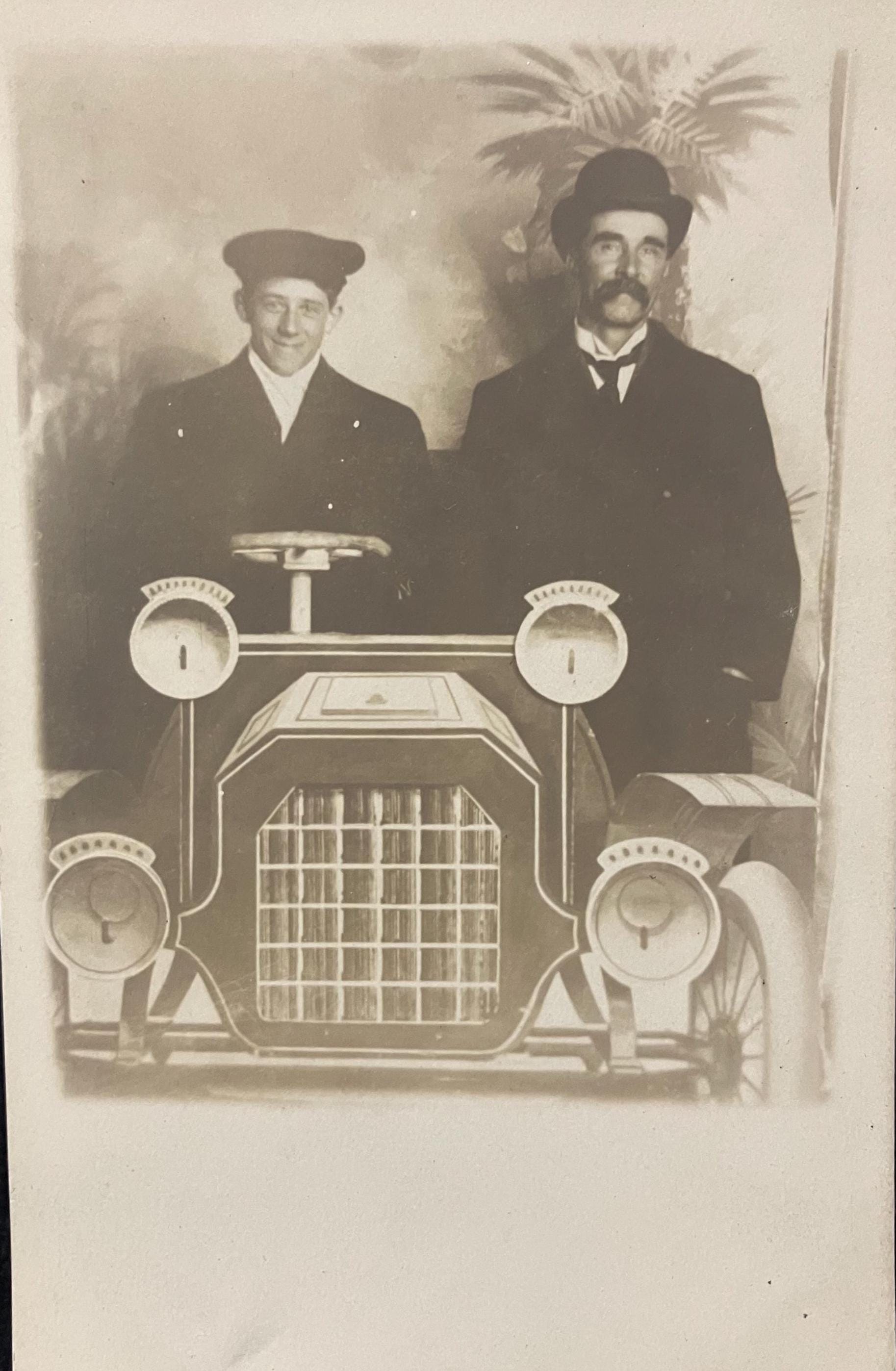 RPPC - Men Posing in a Photographer's Prop Car - One in a Dapper Driving Outfit, the second looking Wealthy and Wise - Likely a Parody Photo