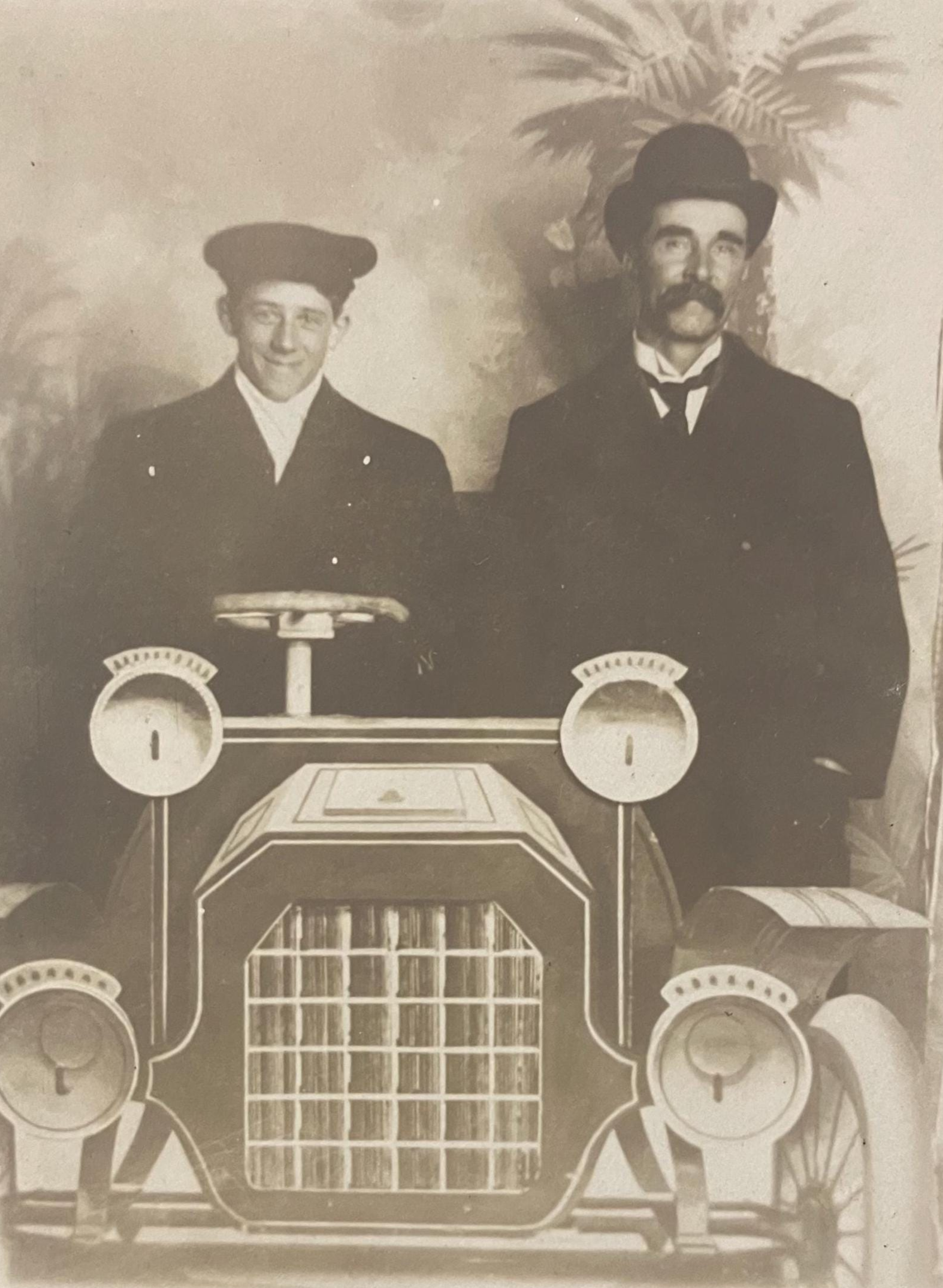 Men Posing in a Photographer's Prop Car - One in a Dapper Driving Outfit, the second looking Wealthy and Wise - Likely a Parody Photo