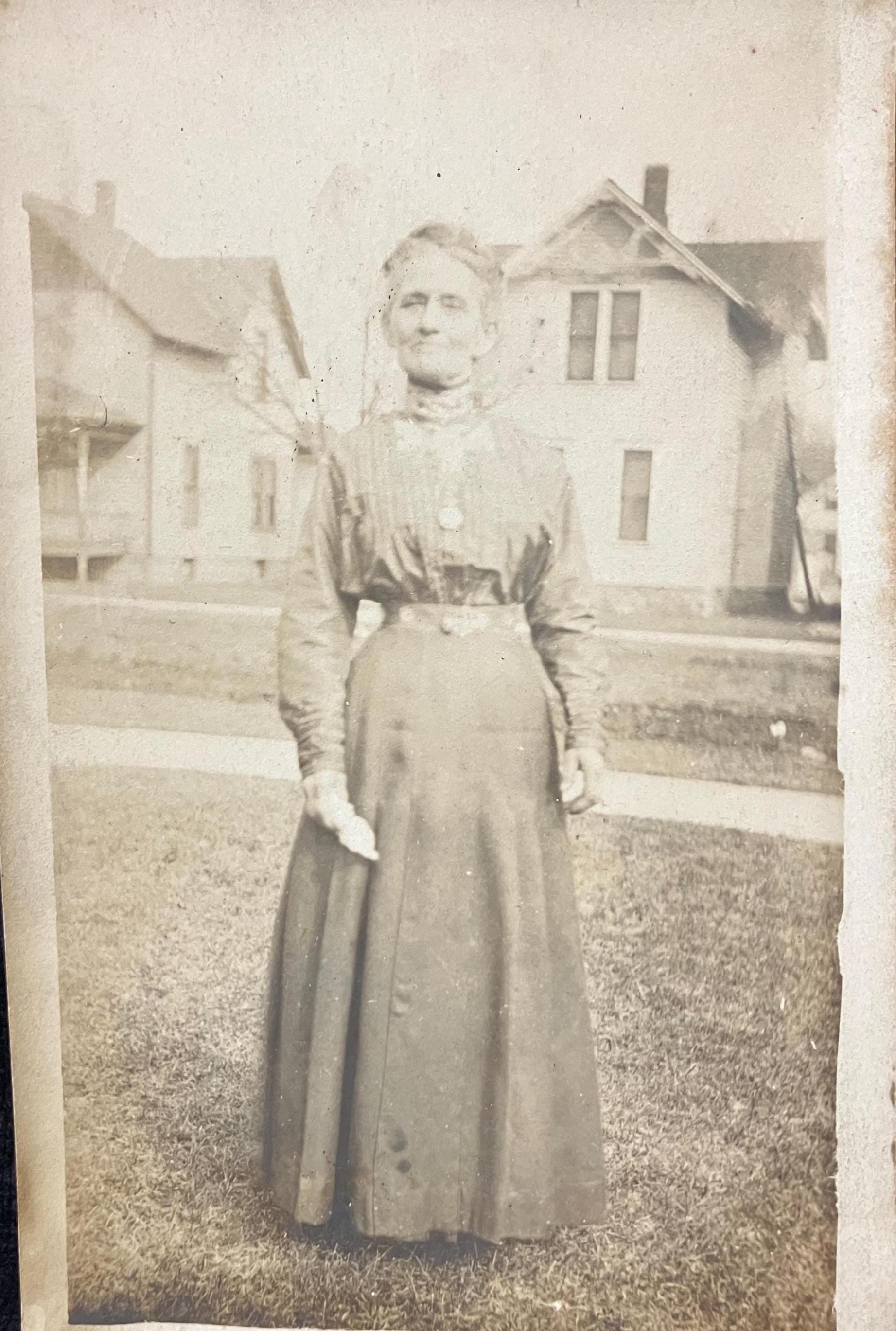 Older Woman Standing in 1890 -1900 Midwestern Neighborhood - Late Victorian Era Clothing and Hairstyle - 1890s real Photo postcard