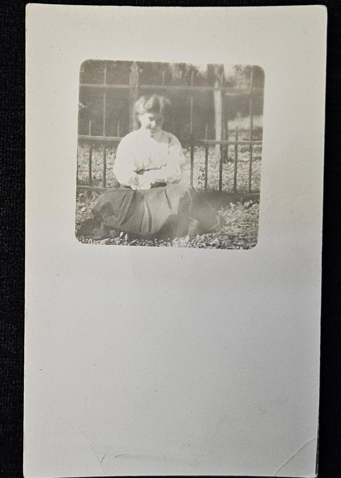 RPPC - Portrait of Smiling Teenage Girl - In Victorian Clothing by Iron Fence - Bashful Teen Posing in Bright Sunshine Real Photo Postcard