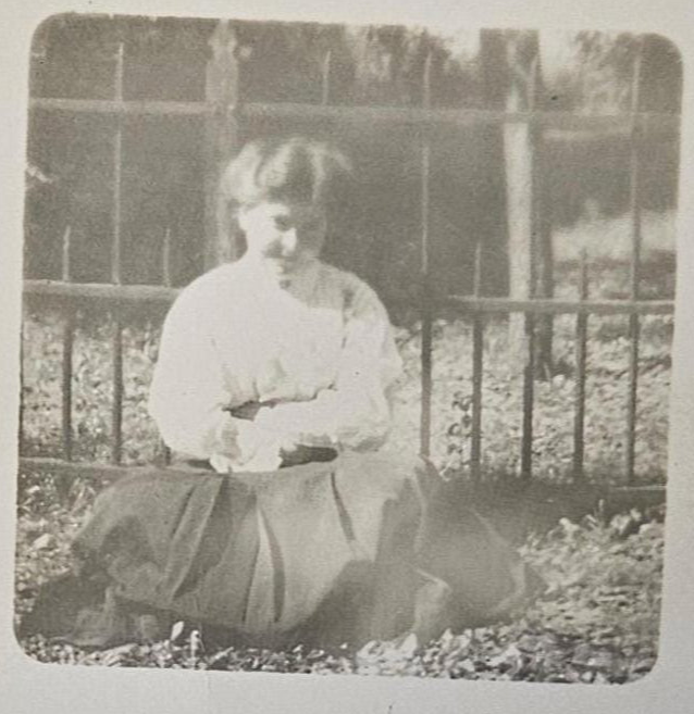 This portrait could have been taken last week, as the bashful smile is all to common on young girls posing before a camera. The clothing is definitely in the Victorian style (1890 -1910), but the card is most likely from the early 1900s. It is on Kodak (AZO ) paper which was available after 1903, but this photo may be an earlier photo and was photographed to put on this card to create a postcard format which could be mailed. The Postal stamp area has 4 triangles going up which dates 1904 to 1918. The bottom two corners each have a crease line. See Photos