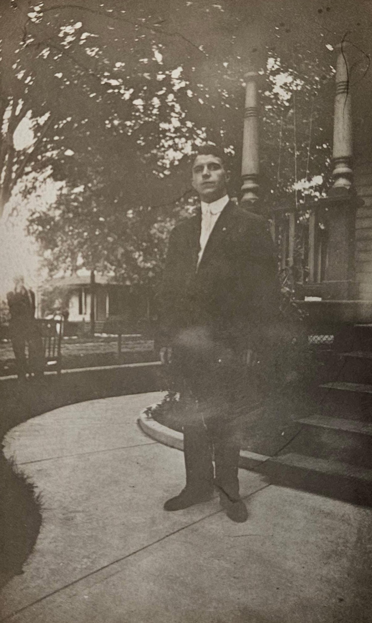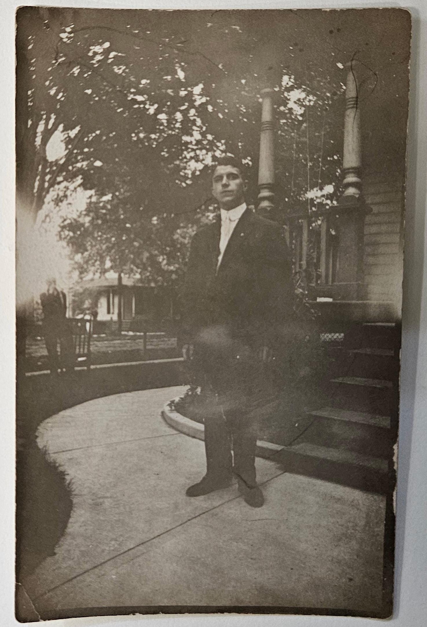 RPPC - Portrait - Young Man in Suit by Porch Steps about 1915 - stampbox was dated 1904 to 1918 - Full bleed photo -Maybe J. Edgar Hoover