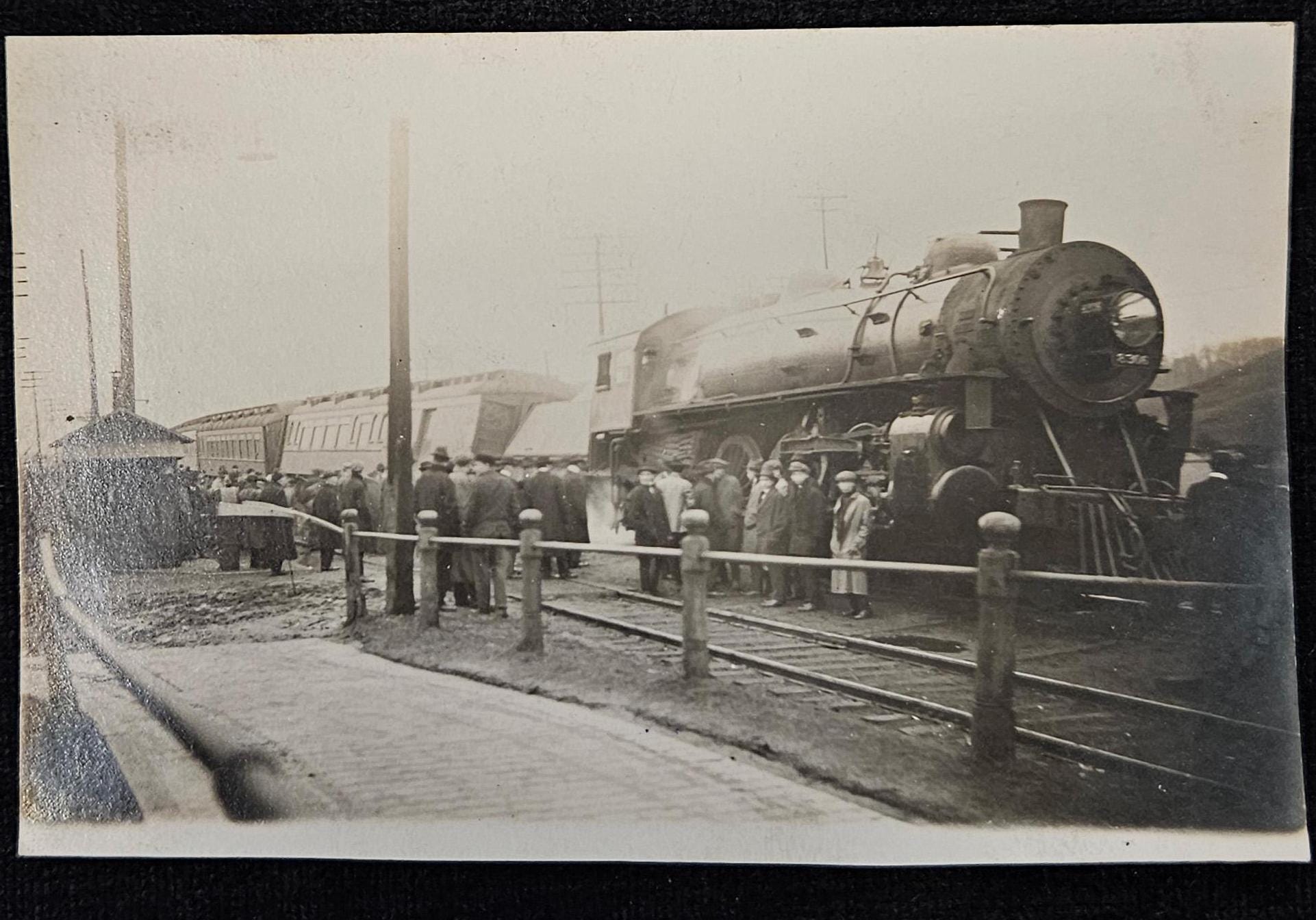 RPPC - Train Wreck with Crowd of Men Observing - 1915 Real Photo Postcard with Train Car Tipped to Side