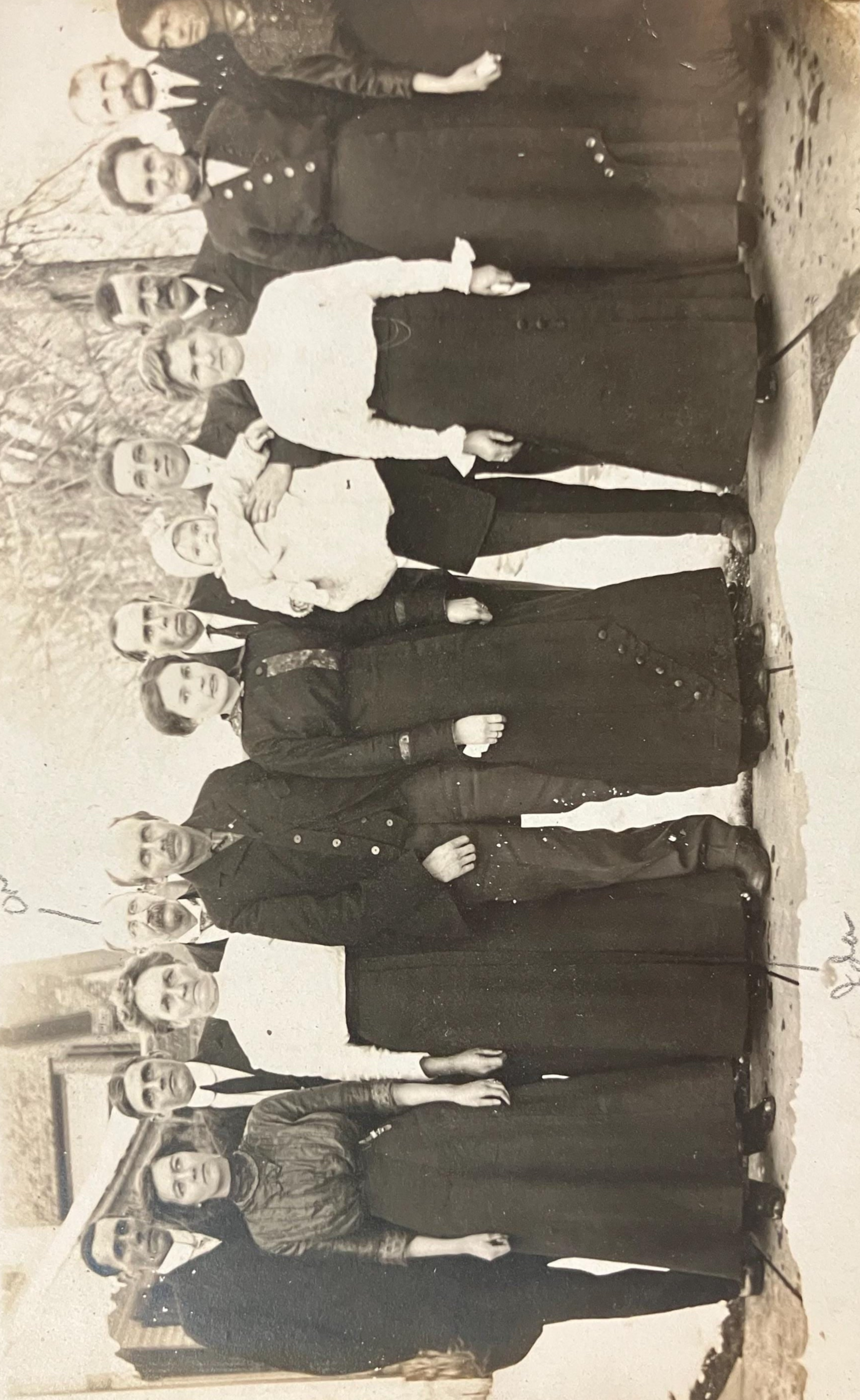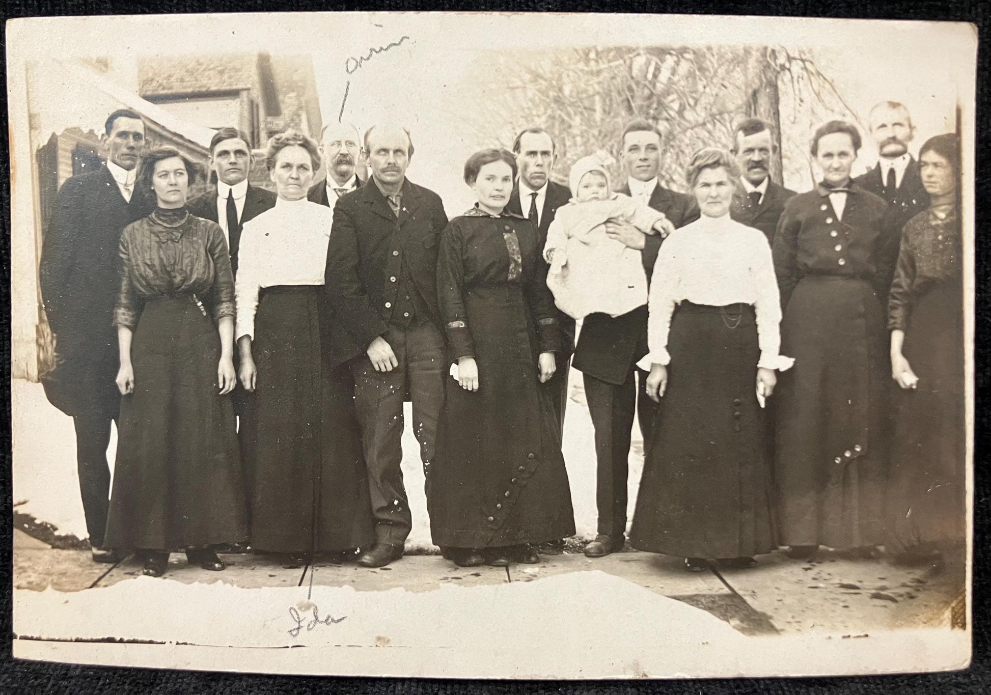 Fourteen Member Family stand with Baby. Is it for Baptism? No other small children, but original family members can be found by looking. Ormin [Fifth from the Left] Ida [fourth from the Left] are identified on the card in ink. The picture was with several others identified as taken in South Haven Michigan
