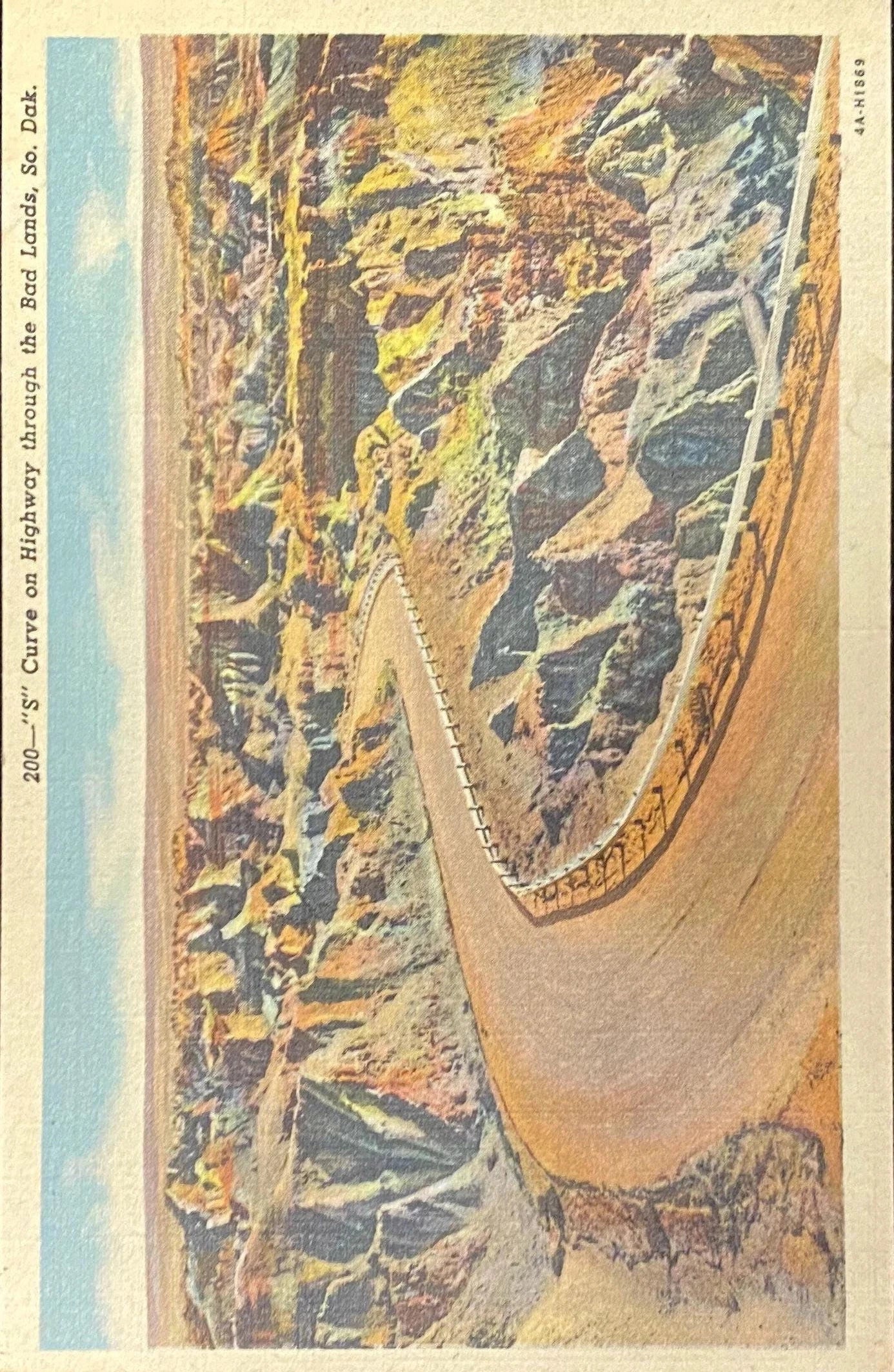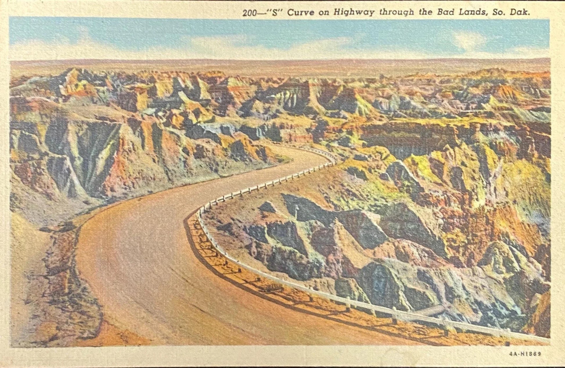 S Curve on Highway - Bad Lands, South Dakota - 1934 Linen Postcard