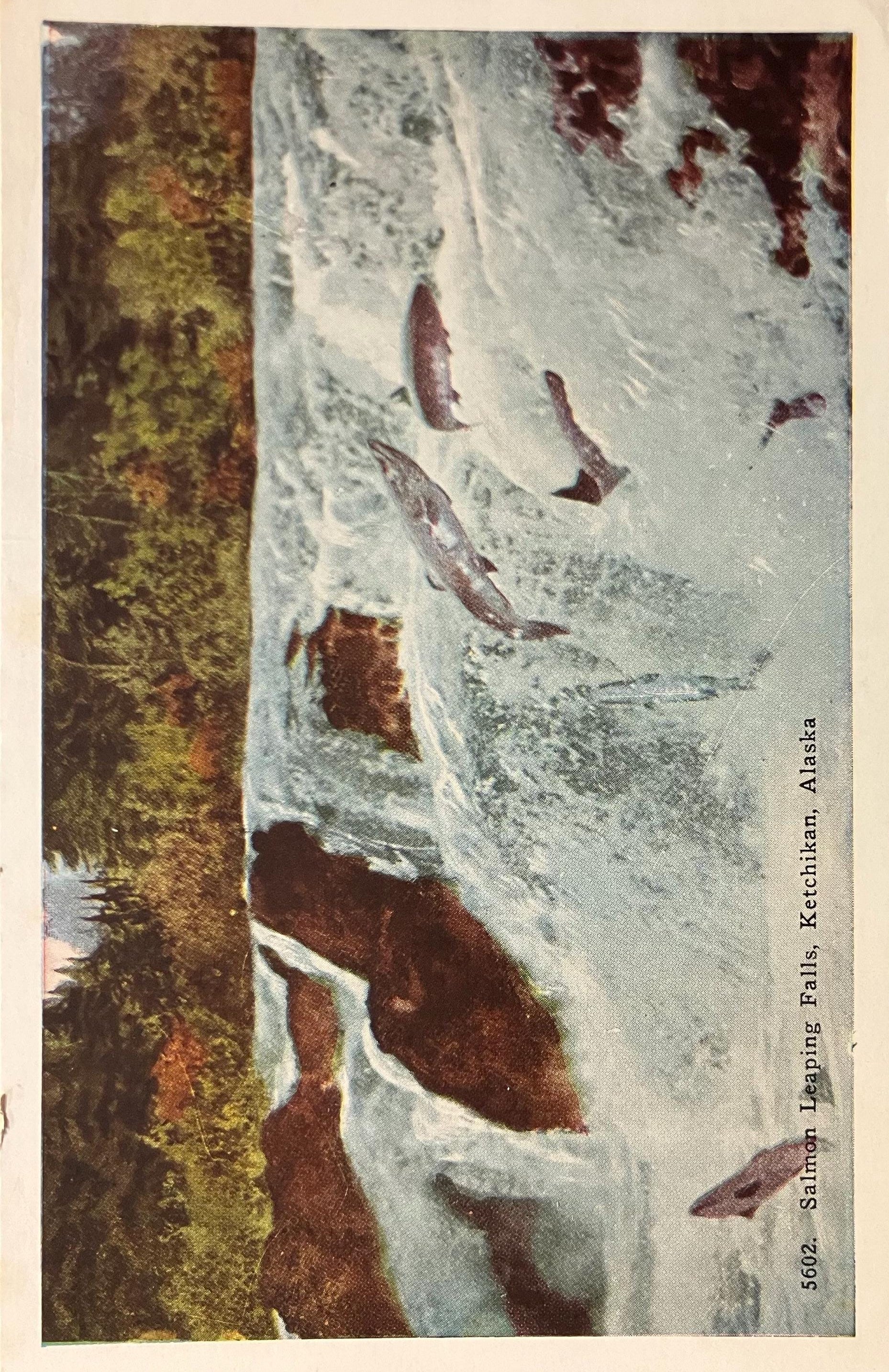 Back: Salmon Leaping Falls. From July to September of run of salmon up Ketchikan Creek attracts thousands of sightseers. The waters teem with fish leaping and struggling to work their way up stream to the spawning grounds above the falls.