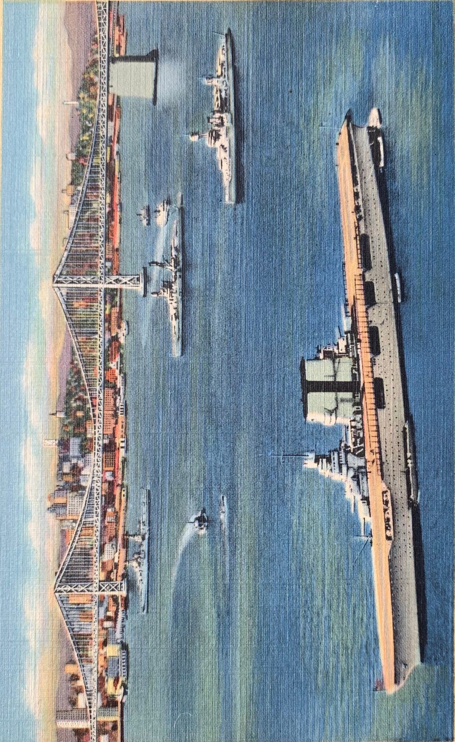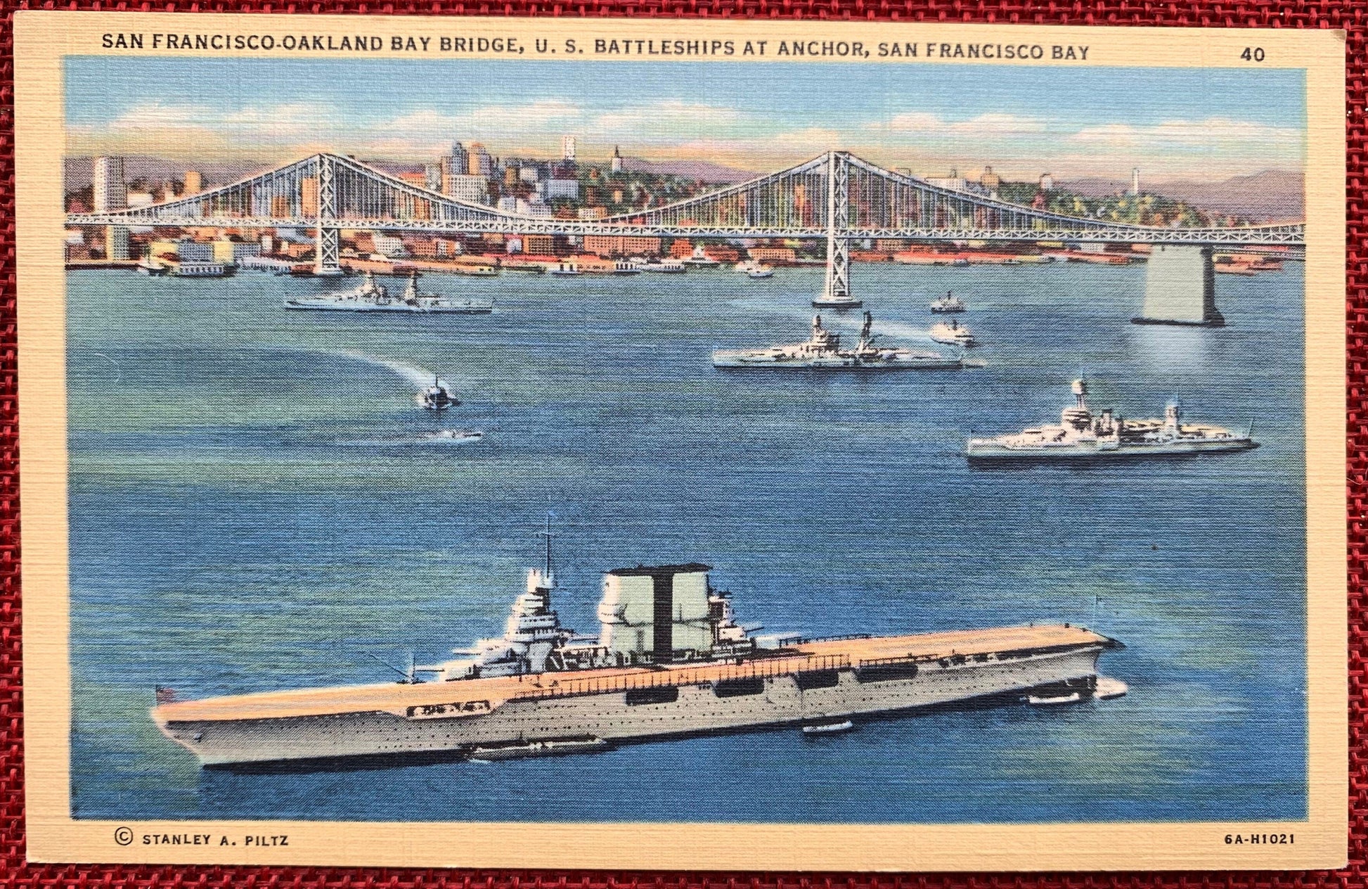 Oakland Bay Bridge - U.S. Battleships at Anchor - San Francisco Bay, California - 1940s Linen Postcard