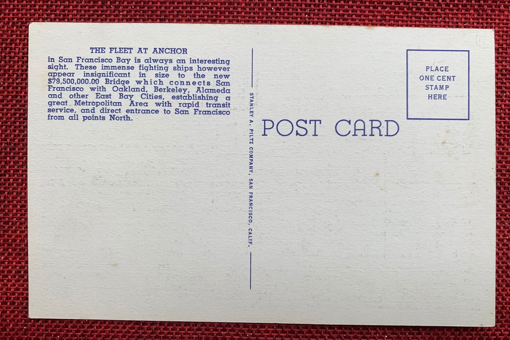 This linen postcard features a hand tinted photograph of United States Battleships at anchor in the San Francisco Bay, with the San Francisco-Oakland Bay Bridge in the background.