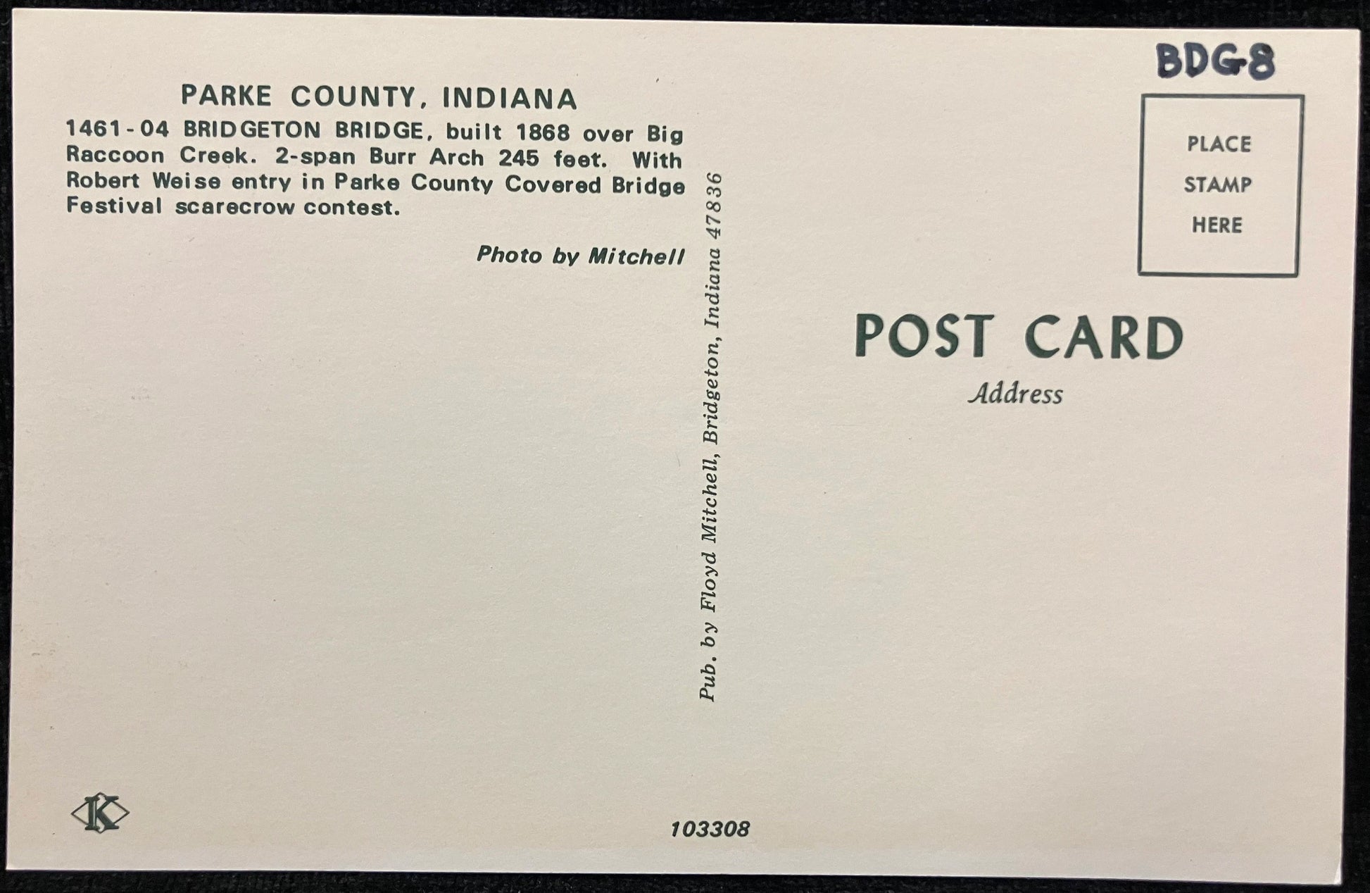 Back: PARKE COUNTY, INDIANA 1461-04 BRIDGETON BRIDGE, built 1868 over Big Raccoon Creek. 2-span Burr Arch 245 feet. With Robert Weise's entry in Parke County Covered Bridge Festival scarecrow contest.