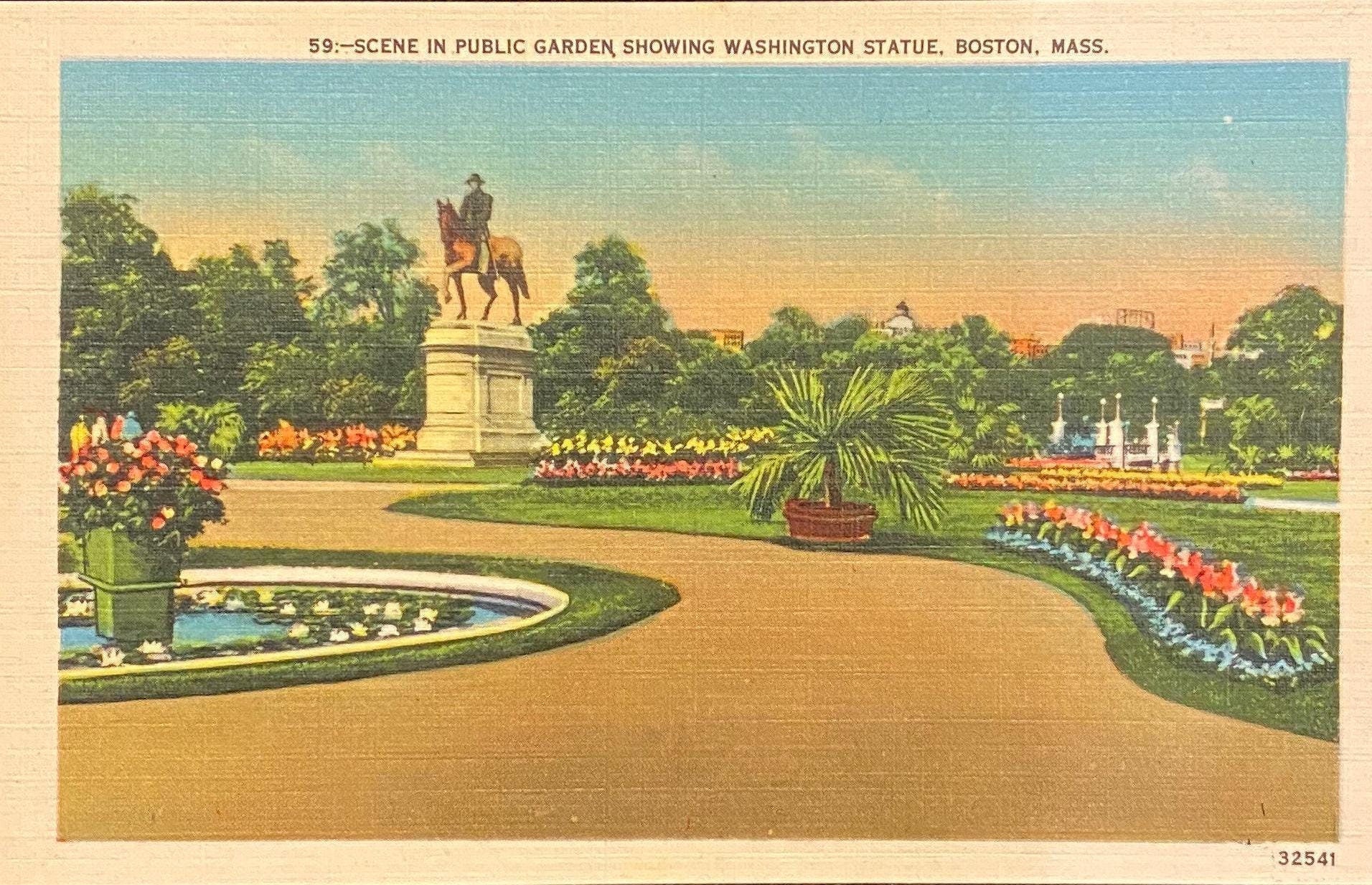 Scene in Public Garden - Washington Statue - Boston, Massachusetts - 1940s Linen Postcard