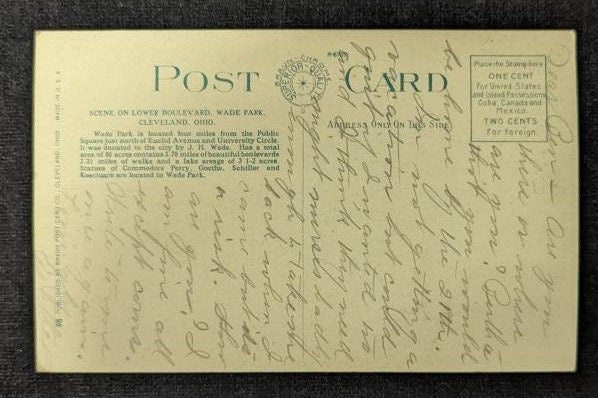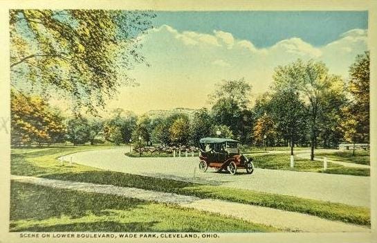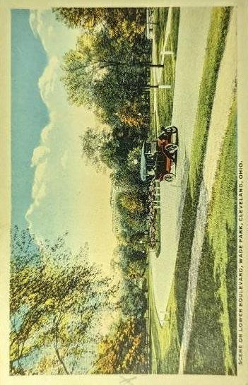 Back: Wade Park is located four miles from the Public Square just north of Euclid Avenue and University Circle. It was donated to the city by J.H. Wade. HAs a total area of 85 acres contains 3.78 miles of beautiful boulevards 3.31 miles of walks and a lake acreage of 3 1-2 acres. Statues of Commodore Perry, Goethe. Schiller and Kosciuaco are located in Wade Park