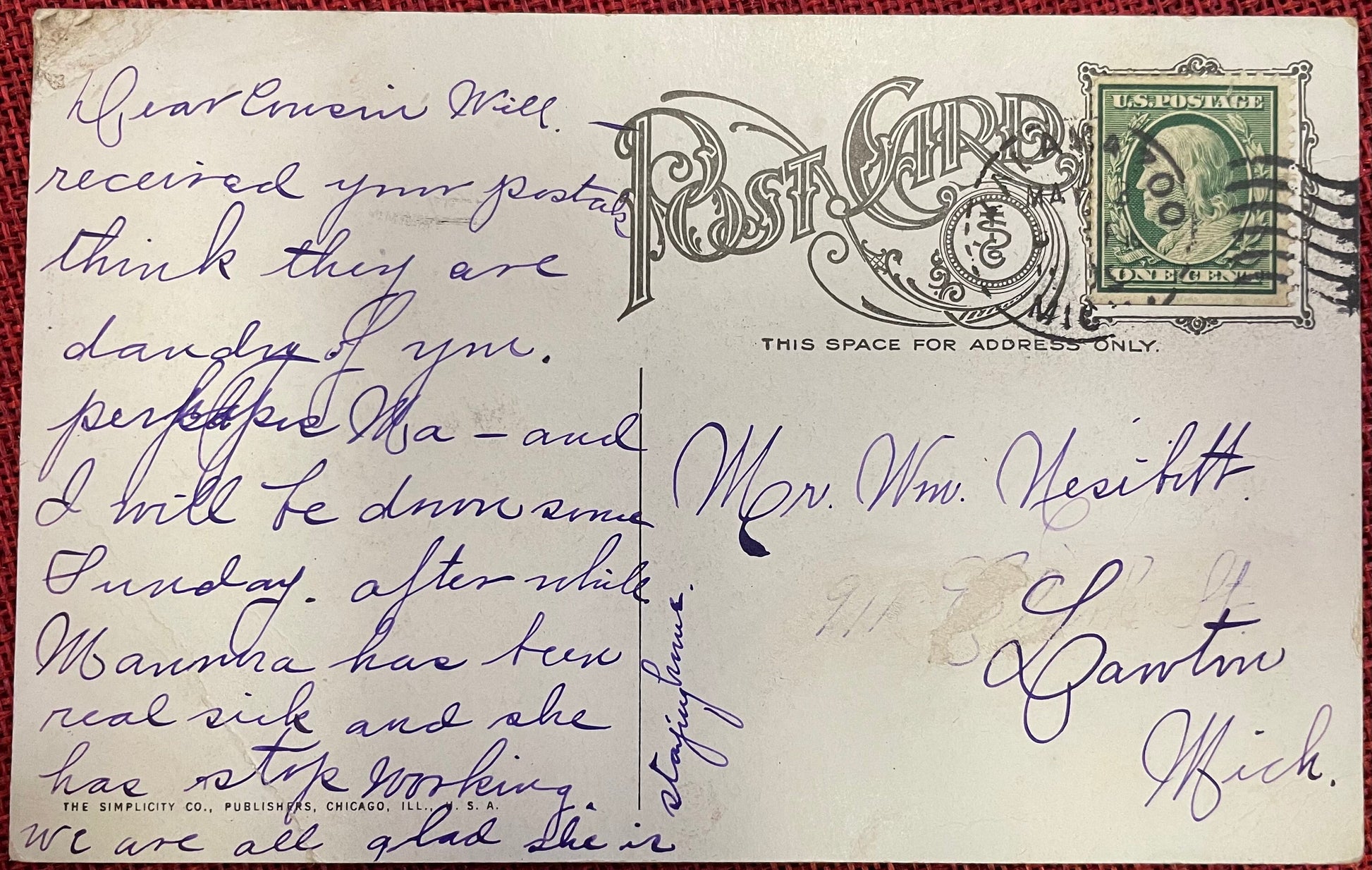 Has been mailed and was postmarked in Kalamazoo, Michigan. Date is illegible, unfortunately. Card has a green one-cent George Washington stamp.